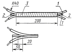 Образцы должны быть скручены в том же направлении, в каком наложена волокнистая изоляция. Петля на конце скрученного образца должна быть разрезана в двух местах (черт. 3), с противоположной стороны образца на обоих концах должна быть удалена изоляция. Черт. 3 Напряжение должно быть приложено к неизолированным концам скрученного образца и плавно поднято до пробоя изоляции. Скорость подъема напряжения должна быть приблизительно 100 В/с, если пробой изоляции наступает при напряжении равном или более 2500 В, скорость подъема напряжения должна быть приблизительно 500 В/с. Значение напряжения в начале испытания (непосредственно после включения) допускается не более 10 % от нормируемого значения пробивного напряжения. (Измененная редакция, Изм. № 3, 4). 3.1.4. Для проводов со стекловолокнистой, эмалево-стекловолокнистой, дельтаасбестовой и пленочно-волокнистой изоляцией устанавливают два нижеприведенных вида испытаний. В стандарте или технических условиях, устанавливающих технические требования на обмоточные провода, должен быть указан вид испытания. 3.1.4.1. Образцы провода для испытаний подготавливают в соответствии с требованиями ГОСТ 15634.3. Образец провода в виде винтовой спирали или изогнутом состоянии должен быть снят со стержня и помещен в ванну с металлическими шариками таким образом, чтобы слой дроби, окружавшей его, составлял не менее 5 мм; концы образца длиной 75 - 100 мм должны быть выведены из ванны; с одного конца образца на длине 15 - 20 мм должна быть удалена изоляция. Образец провода прямоугольного сечения, изогнутый по меньшей стороне, помещают в ванну с металлическими шариками сначала одной изогнутой частью и проводят испытания, а затем испытания повторяют, помещая в ванну вторую изогнутую часть образца. Для удобства проведения испытаний Напряжение должно быть приложено к неизолированному концу образца и к металлическим шарикам и плавно поднятого до пробоя изоляции. Скорость подъема напряжения должна быть приблизительно 100 В/с; если пробой изоляции наступает менее чем через 5 с, скорость подъема напряжения должна быть уменьшена. Значение напряжения в начале испытания (непосредственно после включения) допускается не более 10 % от нормируемого значения пробивного напряжения. 3.1.4.2. Образец провода должен быть разрезан на два равных отрезка; с одного конца каждого отрезка на длине 15 - 20 мм должна быть удалена изоляция. Отрезки провода круглого сечения с проволокой диаметром до 2,50 мм должны быть навиты на стержень из изоляционного материала двумя один над другим плотно прилегающим друг к другу рядами; каждый ряд должен состоять из шести витков, плотно прилегающих друг к другу; витки каждого ряда должны быть навиты в одном направлении; концы отрезков (при необходимости) должны быть закреплены на стержне, чтобы избежать смещение витков. Навивание отрезков должно быть проведено под натяжением, создаваемым для алюминиевой проволоки грузом массой 0,5 кг и для медной проволоки - 1 кг, приходящимся на 1 мм2 площади поперечного сечения проволоки. Отрезки провода круглого сечения с проволокой диаметром 2,50 мм и более и прямоугольного сечения должны быть параллельно расположены и плотно прижаты друг к другу (прямоугольного сечения - плашмя (по толщине) и на длине 200 мм скреплены обмоткой из изоляционной ленты или другим способом, обеспечива
