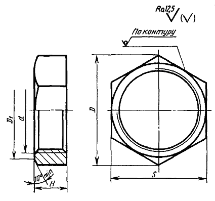 Дата введения 01.01.78 1. Настоящий стандарт распространяется на контргайки для резьбовых соединений трубопроводов общемашиностроительного применения. Все требования настоящего стандарта являются обязательными. Стандарт может быть использован для сертификации с объемами и методами сертификационных испытаний по ГОСТ 15763. (Измененная редакция, Изм. № 3). 2. Конструкция и основные размеры контргаек должны соответствовать указанным на чертеже и в таблице.