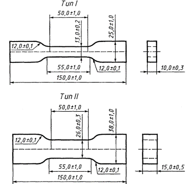 Дата введения 01.01.71 Настоящий стандарт распространяется на ячеистые эластичные пластмассы и устанавливает метод испытания их на растяжение. Применение метода предусматривается в стандартах и технических условиях на ячеистые эластичные пластмассы. Сущность метода состоит в испытании образца на растяжение, при котором определяют: а) разрушающее напряжение при растяжении в МПа - отношение максимальной нагрузки, при которой разрушился образец, к начальной площади его поперечного сечения; б) относительное удлинение при разрыве в процентах - отношение приращения длины рабочего участка образца, измеренного в момент разрыва, к его первоначальной длине. В стандарт введен международный стандарт ИСО 1798-83. (Измененная редакция, Изм. № 1, 2). 1. АППАРАТУРА1.1. Испытание проводят на любой разрывной машине, которая в процессе испытания должна обеспечивать постоянную скорость раздвижения захватов и измерение нагрузки с погрешностью не более 1,0 % от измеряемой величины. 1.2. Захваты машины должны обеспечивать надежное крепление образцов и совпадение продольной оси образца с направлением растяжения. 1.3. Удлинение рабочего участка образца измеряют отсчетным устройством машины, масштабной линейкой или другим измерительным приспособлением, обеспечивающим непрерывность измерения с погрешностью не более 1,0 мм. (Измененная редакция, Изм. № 2). 1.4. Прибор для измерения линейных размеров образцов выбирают в соответствии с ГОСТ 25015. (Измененная редакция, Изм. № 2). 2. ОБРАЗЦЫ ДЛЯ ИСПЫТАНИЙ2.1. Образцы для испытаний должны иметь форму двусторонней лопатки толщиной (10,0 ± 0,3) или (15,0 ± 0,5) мм. Размеры образцов соответствуют размеру вырубных ножей, указанных на черт. 1. Состояние режущих кромок ножей и их параллельность должны соответствовать ГОСТ 270. Черт. 1 (Измененная редакция, Изм. № 2). 2.2. Образцы типа I используют при испытании мелкоячеистых пластмасс, образцы типа II - при испытании крупноячеистых пластмасс, средний линейный размер ячейки которых превышает 2 мм, но не более 5 мм. Тип образца должен быть указан в стандартах или технических условиях на материал. (Измененная редакция, Изм. № 1). 2.3. Образцы вырубают штанцевым ножом из заготовки толщиной (10,0 ± 0,3) мм или (15,0 ± 0,5) мм так, чтобы их продольная ось была перпендикулярна направлению вспенивания. Штанцевые ножи должны обеспечивать ширину рабочего участка образца (13,0 ± 0,2) мм или (26,0 ± 0,3) мм. Другие направления вырезки образцов должны быть указаны в стандартах или технических условиях на материал. (Измененная редакция, Изм. № 2). 2.4. Образцы должны иметь ровную поверхность без поверхностной пленки и видимых дефектов ячеистой структуры. Допускается использовать образцы с поверхностной пленкой, если это предусмотрено в нормативно-технической документации на материал. (Измененная редакция, Изм. № 1). 2.5. Количество образцов, взятых для испытания, указывается в стандартах или технических условиях на материал и должно быть не менее пяти. 2.6. Перед испытанием образцы кондиционируют по ГОСТ 12423 не менее 16 ч при (23 ± 2) °С и относительной влажности (50 ± 5) %, если в нормативно-технической документации нет других указаний. (Измененная редакция, Изм. № 2). Черт. 2 3. ПРОВЕДЕНИЕ ИСПЫТАНИЯ3.1. Испытание проводят при температуре воздуха в помещении (23±2) °С и относительной влажности (50 ± 5) %, если в стандартах или технических условиях на