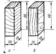 а - в радиальном направлении; б - в тангентальном направлении. Образцы для определения модуля упругости при сжатии поперек волокон. Высоту образца берут в радиальном или тангентальном направлении. Допускается применять клееные образцы при условии, чтобы между клеевыми швами центральная часть высоты была не менее 40 мм. 2.2. Точность изготовления, влажность и количество образцов должны соответствовать требованиям ГОСТ 16483.0-78. 3. ПРОВЕДЕНИЕ ИСПЫТАНИЯ3.1. В каждом образце измеряют кривизну годовых слоев, которая определяется как отношение, в процентах, стрелы дуги годичного слоя, проходящего по середине образца, к хорде длиной 2 см. 3.2. Толщину a и ширину b поперечного сечения образцов измеряют по середине длины с погрешностью не более 0,1 мм. 3.3. Для измерения деформаций на противоположных боковых сторонах рабочей части образцов, радиальной или тангентальной, устанавливают два тензометра - по одному на каждую сторону, строго по разметке. На образцах предварительно проводят продольные осевые линии и делают на них отметки - одну но середине образца и две - в местах крепления ножек тензометров. Под ножками тензометров клеем БФ-2 наклеивают подкладки из латуни по ГОСТ 931-78 толщиной от 0,5 до 1,0 мм, размером 5´5 мм. Тензометры крепят на образцах устойчиво при помощи струбцин. Правильность установки тензометров проверяют легким постукиванием пальца по образцу. При правильной установке освобожденная стрелка тензометра колеблется около одного и того же деления шкалы. 3.4. Усилие при испытании должно совпадать с продольной геометрической осью образца. Каждый образец подвергают шестикратному нагружению от 100 до 400 Н. Нагружение производят равномерно со средней скоростью 4000 ± 500 Н. Первоначально образец нагружают до 100 Н н отсчитывают показания по тензометрам, затем нагружают до верхнего предела нагружения 400 Н и вновь отсчитывают по тензометрам. После этого образец плавно разгружают несколько ниже нижнего предела нагружения и вновь нагружают в той же последовательности. Отсчеты по тензометрам, соответствующие верхнему и нижнему пределам нагружения, берут до 0,5 деления шкалы. 3.5. После испытаний определяют влажность образцов по ГОСТ 16483.7-71. Пробу на влажность вырезают длиной около 30 мм из средней части образцов. Для определения средней влажности партии образцов допускается отбирать каждый девятый образец, по не менее трех. (Измененная редакция, Изм. № 1). 4. ОБРАБОТКА РЕЗУЛЬТАТОВ4.1. Модуль упругости (EW) образцов с влажностью W в момент испытания вычисляют с точностью до 0,5·107 Па по формуле