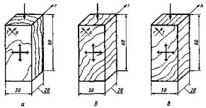 а - в радиальной плоскости при сжатии под углом 45° к направлению волокон и радиальной плоскости (тангентальный образец); б - в тангентальной плоскости при сжатии под углом 45° к направлению волокон и тангентальной плоскости (радиальный образец); в - в радиальной или тангентальной плоскости при сжатии под углом 45° к радиальной и тангентальной плоскостям (торцовый образец) Допускается применять клееные образцы при условии, чтобы между клеевыми швами центральная часть высоты образца была не менее 40 мм. 2.2. Точность изготовления, влажность и количество образцов должны соответствовать требованиям ГОСТ 16483.0. При определении минимального количества образцов коэффициент вариации принимают 30 %. 3. ПРОВЕДЕНИЕ ИСПЫТАНИЯ3.1. В каждом образце измеряют кривизну годичных слоев, которую определяют как отношение (в процентах) стрелы дуги годичного слоя, проходящего по середине образца, к хорде длиной 2 см. 3.2. Толщину и ширину образцов измеряют по середине их длины с погрешностью не более 0,1 мм. 3.3. На широких боковых поверхностях каждого образца проводят осевые линии. На них на расстоянии 10 мм от точки пересечения намечают места установки ножек тензометров (см. чертеж). Под ножки тензометров наклеивают (клей БФ-2 по ГОСТ 12172) подкладки из латуни по ГОСТ 931 толщиной от 0,5 до 1,0 мм, размером 5´5 мм. 3.4. На каждом образце измерение деформации производят последовательно сначала в продольном, затем в поперечном направлениях, для чего на противоположных боковых сторонах образца устанавливают одновременно два тензометра, по одному на каждую сторону, и закрепляют струбциной. Расположение ножек тензометров должно строго соответствовать разметке. Правильность установки тензометров проверяют легким постукиванием пальца по образцу. При правильной установке освобожденная стрелка тензометра колеблется около одного и того же деления шкалы. 3.5. Усилие при испытании должно совпадать с продольной геометрической осью образца. Для измерения деформации в одном направлении каждый образец подвергают шестикратному нагружению на сжатие в пределах от 150 до 600 Н. Нагружение производят равномерно со средней скоростью (6000 ± 500) Н/мин. Порядок нагружения и измерения деформаций следующий: сначала образец нагружают до нижнего предела нагружения, т. е. до 150 Н и сразу берут отсчет по тензометрам, затем образец нагружают до верхнего предела, т. е. до 600 Н и снова берут отсчет. После этого образец плавно разгружают несколько ниже нижнего предела, примерно на 15 %, и вновь нагружают в той же последовательности. Отсчеты по тензометрам берут до 0,5 деления шкалы. (Измененная редакция, Изм. № 2). 3.6. После испытаний определяют влажность образцов по ГОСТ 16483.7. Пробу на влажность длиной около 30 мм вырезают из средней части образца по всему поперечному сечению. Для определения средней влажности партии образцов допускается отбирать каждый девятый образец, но не менее трех. (Измененная редакция, Изм. № 1). 4. ОБРАБОТКА РЕЗУЛЬТАТОВ4.1. Для обозначения модулей сдвига G при различных направлениях сжатия относительно направления годичных слоев и волокон при G ставят два индекса, из которых первый означает плоскость, в которой происходит сдвиг, а второй - направление сжатия, вызвавшего сдвиг. Направление вдоль волокон обозначают индексом a, поперек волокон в радиальном направлении - индексом r и в тангент