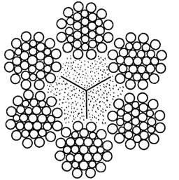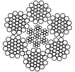 Дата введения 01.07.89 Настоящий стандарт распространяется на стальные талевые канаты, используемые на буровых установках для эксплуатационного и глубокого разведочного бурения нефтяных и газовых скважин. Требования пп. 1.1, 1.3, 2.4, 2.5, 2.6, 2.7, 2.14, 4.2, 4.4 являются обязательными. (Измененная редакция, Изм. № 1). 1. ОСНОВНЫЕ ПАРАМЕТРЫ И РАЗМЕРЫ1.1. Канаты должны изготовляться типа ЛК-РО конструкции 6´31 (1 + 6 + 6 / 6 + 12) с металлическим сердечником конструкции 7´7 (м. с.) или органическим сердечником (о. с.). 1.2. Канаты должны изготовляться правой крестовой свивки. Направление свивки проволок в прядях каната должно быть противоположным направлению свивки каната. Допускается изготовлять канаты левой крестовой свивки. 1.3. Основные параметры и размеры канатов должны соответствовать черт. 1, 2 и табл. 1, 2. Диаметры проволок в канатах являются расчетными и могут уточняться в пределах ± 0,1 мм, при этом диаметры канатов не должны выходить за пределы допускаемых отклонений, приведенных в п. 2.4. Шестипрядный канат 6´31 + 1 м. с.; 6 ´ 31 = 186 проволок с металлическим сердечником конструкции 7 ´ 7 = 49 проволок (прядь каната 1 + 6 + 6 / 6 + 12; прядь сердечника 1 + 6). Черт. 1 Шестипрядный канат 6´31 + 1 о. с.; 6 ´ 31 = 186 проволок с органическим сердечником (прядь каната 1 + 6 + 6 / 6 + 12). Черт. 2 Таблица 1