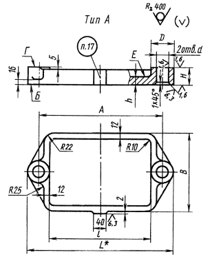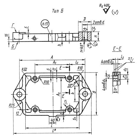 Пример условного обозначения плиты размером А = 250 мм: Плита 7030-1221 ГОСТ 16893-71 4. Материал для плит типа А - чугун марки СЧ 30 по ГОСТ 1412. Допускается заменять на чугун других марок с механическими свойствами не ниже, чем у чугуна марки СЧ 30. Материал для плит типа Б - отливка 45Л-1 по ГОСТ 977. 3, 4. (Измененная редакция, Изм. № 1, 2). 5. Неуказанные литейные радиусы - 4...6 мм. 6. Формовочные уклоны - по ГОСТ 3212. 7. Предельные отклонения на отливку для плит типов А и Б по размерам и массе и припуски на механическую обработку - по III классу точности ГОСТ 26645. 8. Отливки подвергнуть старению. 9. Покрытие механически необработанных поверхностей - эмаль ХВ-124 голубовато-зеленая ГОСТ 10144, Ш.УХЛ. 6/1 (обозначение покрытия по ГОСТ 9.032). (Измененная редакция, Изм. № 2). 10. Неуказанные предельные