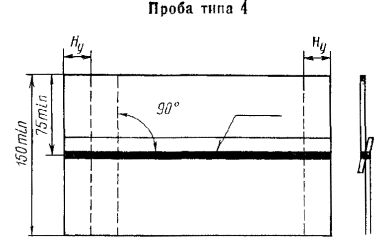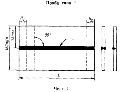 Черт. 3 Черт. 4 Черт. 5 2.4. Испытания швов сварных соединений на ударный изгиб проводят на образцах без надреза. 2.5. Для всех видов испытаний шов сварного соединения должен быть расположен в середине образца и перпендикулярно плоскости его вырезки. 2.6. Для всех видов испытаний образцы вырезают из контролируемого сварного соединения или из проб фрезерованием для материалов толщиной более 1 мм и специальным приспособлением по ГОСТ 14236-69 - для пленочных материалов. 2.7. Толщина материала пробы должна соответствовать толщине материала контролируемого изделия. Длина пробы L (см. черт. 1) определяется количеством вырезаемых из нее образцов с учетом припусков на ширину реза и последующую обработку, а также ширину неиспользуемых участков Ну шва сварного соединения. Ширина неиспользуемых участков в начале и в конце пробы должна быть не менее: 20 мм - при сварке нагретым газом с присадочным прутком или при сварке нагретой экструдированной присадкой; 15 мм - при сварке высокочастотным и термоконтактным методом. 2.8. Стрела прогиба образца, сваренного из листового материала, измеренная на базе 200 мм, не должна превышать 5 % толщины образца или пробы, но не более 2 мм. 2.9. Взаимное смещение кромок шва сварного соединения образца, изготовленного из контролируемого изделия или из пробы типа 1 (см. черт. 1) не должно превышать 5 % толщины образца. 2.10. Правка образца перед испытанием или пробы перед вырезкой из нее образцов не допускается. 2.11. Маркировку производят клеймением или наносят несмываемой краской: образца - на нерабочей части; пробы - на неиспользуемых участках (Ну). Маркировка должна сохраняться на образцах после их испытаний. 3. ПРОВЕДЕНИЕ ИСПЫТАНИЙ3.1. Наружный осмотр и обмер 3.1.1. Наружным осмотром выявляют: трещины, непровары, смещение кромок, неправильность геометрической формы сварного шва, несоответствие размеров сварного шва. 3.1.2. Швы сварных соединений осматривают с обеих сторон по всей протяженности с применением увеличительных приборов с увеличением в 10 раз. 3.1.3. Размеры сварного шва и выявленные дефекты (обмер) измеряют мерительным инструментом с точностью ±0,01 мм. 3.1.4. Для выявления внутренних дефектов шва сварного соединения (непроваров, трещин, пор, газовых и твердые инородных включений) осматривают визуально излом на одном образце из каждой пробы. 3.2. Механические испытания на растяжение 3.2.1. Испытания на растяжение листовых материалов толщиной более 1 мм проводят на образцах типа 2 или 3 по ГОСТ 11262-68, пленочных материалов - по ГОСТ 14236-69; для испытания необходимо брать не менее пяти образцов. 3.2.2. Прочность шва сварного соединения выражается коэффициентом сохранения свойств (K) в процентах - как отношение прочности свариваемого материала (σр) к прочности шва сварного соединения (σ'р) - и рассчитывается по формуле: K = (σ'р/σр)·100. 3.2.3. В протоколе испытания указывают конструкцию шва, место его отбора (для образцов, изготовленных из изделия), место разрушения, температуру испытания, данные испытания для всех образцов, результат испытания и коэффициент сохранения свойств. 3.2.4. При необходимости проведения испытаний на растяжение швов сварных соединений после воздействия на них агрессивных сред отбирают не менее 20 образцов по ГОСТ 11262-68. Половину образцов помещают в среду. Время выдержки образцов в среде, температуру среды и порядок испытаний уст