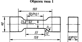 Дата введения 01.01.73 Настоящий стандарт распространяется на жесткие ячеистые пластмассы и устанавливает метод испытания на растяжение. Сущность метода заключается в определении максимального напряжения при растяжении образца, а также в определении разрушающего напряжения в момент разрыва образца и относительного удлинения при максимальном напряжении и относительного удлинения при разрыве образца. В стандарт введен международный стандарт ИСО 1926. (Измененная редакция, Изм. № 2). 1. АППАРАТУРА1.1. Испытания проводят на машине, обеспечивающей испытание на растяжение и измерение нагрузки с погрешностью не более 1 % от измеряемой величины в пределах рабочего диапазона измерения нагрузки. 1.2. Испытательная машина должна обеспечивать в процессе испытания постоянную скорость раздвижения захватов, равную (5 ± 1) мм/мин. 1.1, 1.2. (Измененная редакция, Изм. № 1). 1.3. Захваты машины должны обеспечивать надежное крепление образцов и совпадение продольной оси образца с направлением растяжения. 1.4. Прибор для измерения деформации должен обеспечивать измерение с погрешностью до 0,1 мм. Для измерения деформации используют: приборы, закрепляемые непосредственно на образце. При этом масса прибора и способ крепления не должны оказывать существенного влияния на определяемые показатели; приборы, не закрепляемые на образце и позволяющие производить измерение изменения длины рабочей части образца, ограниченной метками, при помощи оптических или других систем измерения. 1.5. Прибор для измерения линейных размеров образцов выбирают в соответствии с ГОСТ 25015. 1.4, 1.5. (Измененная редакция, Изм. № 1). 2. ОБРАЗЦЫ ДЛЯ ИСПЫТАНИЯ2.1. Для испытания применяют образцы типов 1 - 3 (черт. 1 - 3). Черт. 1.
