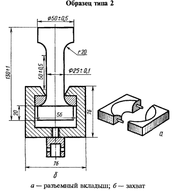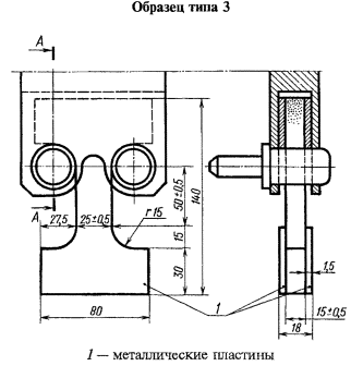 Черт. 2. Черт. 3. 2.2. Образец типа 2 допускается применять для испытания ячеистых пластмасс, толщина которых более 50 мм. 2.1, 2.2. (Измененная редакция, Изм. № 1). 2.3. Образец типа 3 применяют в тех случаях, когда при закреплении образцов типов 1 и 2 в зажимах происходит разрушение ячеистой структуры пластмассы. 2.4. Образцы типов 1 и 3 изготовляют из заготовки механической обработки на фрезерном станке, типа 2 - на токарном станке так, чтобы продольная ось была перпендикулярна к направлению вспенивания материала. Вырезка образцов из заготовки в другом направлении оговаривается особо. 2.5. Образцы типа 3 испытывают с применением усиливающих металлических пластин, формы и размеры которых указаны на черт. 3. Для этого к каждому образцу перед испытанием приклеивают четыре металлические пластины. Рекомендуется использовать металлические пластины из алюминиевых сплавов или алюминия. Клей, применяемый для приклеивания металлических пластин к образцу, должен быть таким, чтобы предел прочности при сдвиге клеевого шва был больше предела прочности при сдвиге ячеистого материала. Клей не должен влиять на свойства материала. Рекомендуется использовать клей на основе эпоксидной смолы. 2.6. Образцы должны иметь ровную поверхность без видимых дефектов ячеистой структуры и механической обработки. 2.7. Количество образцов, взятых для испытаний, должно быть не менее пяти. 2.8. Перед испытанием образцы кондиционируют по ГОСТ 12423 в течение 24 ч при (23 ± 2) °С, если в стандартах и технических условиях на материал нет иных указаний. (Измененная редакция, Изм. № 1). 3. ПРОВЕДЕНИЕ ИСПЫТАНИЯ3.1. Испытание проводят при скорости раздвижения захватов испытательной машины (5 ± 1) мм/мин. 3.2. Перед испытанием на образцы наносят симметрично метки, ограничивающие рабочую часть (базу для измерения деформации), равную (50 ± 0,5) мм. Нанесение меток не должно приводить к изменению свойств материала и к его разрушению по меткам. 3.3. В соответствии с ГОСТ 25015 толщину и ширину образцов измеряют в трех местах по длине рабочей части; в середине и на расстоянии 5 мм от меток. Из полученных значений вычисляют среднее арифметическое, по которому определяют начальное поперечное сечение. 3.1 - 3.3. (Измененная редакция, Изм. № 1). 3.4. Испытание образцов типов 2 и 3 проводят с помощью специальных зажимных приспособлений (черт. 2 и 3). 3.5. На образце, закрепленном в захватах, устанавливают прибор для измерения деформации по п. 1.4. 3.6. В процессе растяжения записывают диаграмму «нагрузка - деформация» вплоть до разрушения образца. 3.7. В расчет принимают результаты, полученные на образцах, разрушившихся в пределах рабочей части. 4. ОБРАБОТКА РЕЗУЛЬТАТОВ4.1. Из диаграммы «нагрузка - деформация» определяют максимальное усиление (Рmax), развиваемое в процессе растяжения, и разрушающее усилие (Рразр) в момент разрыва образца в Н (кгс). 4.2. Максимальное напряжение (σmax) при растяжении и разрушающее напряжение (σразр) в МПа (кгс/см2) вычисляют по формулам: