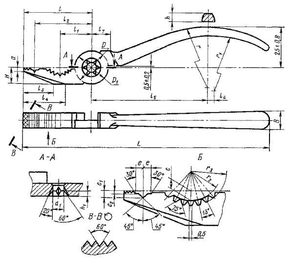 Дата введения 01.07.73 Настоящий стандарт распространяется на пассатижи, предназначенные для захвата и зажима труб и деталей разных форм. Стандарт не распространяется на пассатижи, изготовляемые из материалов, предназначенных для работы во взрывоопасных условиях. Требования настоящего стандарта являются обязательными, кроме п. 2.10, разд. 3, приложений. Стандарт пригоден для целей сертификации на безопасность по пп. 4.7, 4.7а и 4.8. (Измененная редакция, Изм. № 5, 6). 1. ОСНОВНЫЕ РАЗМЕРЫ1.1а. Пассатижи должны изготовляться исполнений: 1 - длиной 160, 180, 200 мм; 2 - длиной 200, 250, 300 мм. (Введен дополнительно, Изм. № 4). 1.1. Основные размеры пассатижей должны соответствовать указанным на черт. 1 и в табл. 1. Пассатижи должны изготовляться без изолирующих или с изолирующими рукоятками в соответствии с ГОСТ 11516. Черт. 1 Примечание. Черт. 1 не определяет конструкцию пассатижей. Таблица 1