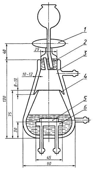 2.3. Подготовка образца топлива 2.3.1. Испытуемое топливо фильтруют через бумажный фильтр при комнатной температуре. 3. ПРОВЕДЕНИЕ ИСПЫТАНИЯ3.1. В нагретый прибор на стеклянную площадку помещают предварительно взвешенную пластинку с известной постоянной травления. Через воронку заливают от 60 до 70 см3 испытуемого топлива, подготовленного по п. 2.3 (пластинка должна быть полностью покрыта топливом), и в желобок заливают 5 см3 дистиллированной воды. (Измененная редакция, Изм. № 3). 3.2. Аппарат закрывают пробкой, в которую заливают дистиллированную воду, добавляя ее по мере испарения, и проводят испытание в течение 4 ч. Момент закрытия аппарата пробкой принимают за начало испытания. (Измененная редакция, Изм. № 2). 3.3. По истечении 4 ч обогрев отключают, пластинки вынимают из аппарата, охлаждают до комнатной температуры. После охлаждения пластинки промывают спиртобензольной смесью, протравливают, как указано в пп. 2.1.2 - 2.1.3, и взвешивают с погрешностью не более 0,0002 г. (Измененная редакция, Изм. № 1, 2). 4. ОБРАБОТКА РЕЗУЛЬТАТОВ4.1. Коррозионную активность топлив в условиях конденсации воды (К) в г/м2 вычисляют по формуле К = где m - масса пластинки до испытания, г; m1 - масса пластинки после испытания, г; h - постоянная травления, г; S - площадь верхней и боковой поверхностей пластинки (одна из поверхностей - нижняя не учитывается, так как прилегает к поверхности площадки и в процессах коррозии не участвует), м2. (Измененная редакция, Изм. № 2). 4.2. За результат испытания принимают среднее арифметическое результатов двух параллельных определений. 4.3. Сходимость метода Два результата определений, полученные одним исполнителем в одной лаборатории, признаются достоверными (с 95 %-ной доверительной вероятностью), если расхождение между ними не превышает 1 г/м2. (Измененная редакция, Изм. № 3). ПРИЛОЖЕНИЕАппарат для определения коррозионной активности бензинов