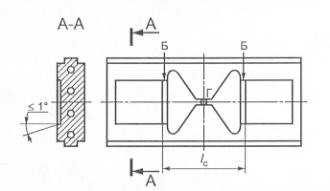 Г – центральный литник с диаметром со стороны сопла не менее 4 мм; Б – впускной литник; lс – расстояние между линиями, вдоль которых образцы для испытаний отрезаются от распределительных литников. Чертеж оформляющей полости и литниковой системы литьевой формы для изготовления образцов типов 6, 7 (пластина D2)