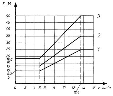 При повторном испытании переменным током применяется 0,8 значения испытательного напряжения. Допускается уменьшать длительность приложения напряжения до 1 с при условии повышения испытательного напряжения на 25 %. 5.2.8. Сопротивление изоляции токоведущих частей электрооборудования относительно корпуса машины в холодном состоянии при отключенной аккумуляторной батарее должно быть не менее 500 кОм. 5.2.9. Сопротивление изоляции токоведущих частей электрооборудования относительно корпуса машины после испытаний на влагоустойчивость должно быть указано в технических условиях на конкретные машины. 5.2.10. Сопротивление изоляции аккумуляторной батареи без электролита относительно батарейного ящика должно быть не менее 20 кОм, а с электролитом в заряженном состоянии относительно корпуса машины - не менее 1 кОм. 5.2.11. Тепловой режим электродвигателей должен быть проверен в условных циклах работы машины. Предельные превышения температур коллекторов электродвигателей над температурой окружающего воздуха не должны быть более значений, установленных ГОСТ 12049. 5.3 Требования к тормозной системе5.3.1. Машины должны иметь два независимых привода тормозов: рабочий и стояночный. Оба привода могут воздействовать на один и тот же элемент торможения. Машины со стоящим водителем могут иметь один общий привод, который должен автоматически затормаживать и отключать цепь электродвигателей передвижения при уходе водителя с площадки управления. 5.3.2. Рабочая тормозная система должна обеспечивать эффективное торможение при однократном нажатии на педаль тормоза. Педаль ножного тормоза после снятия давления ноги водителя должна автоматически возвращаться в исходное положение. 5.3.3. Рабочая тормозная система должна удерживать машину с номинальным грузом на наибольшем преодолеваемом подъеме, установленном в технических условиях на конкретную машину, не менее 0,2 мин, а стояночная тормозная система - не менее 5 мин. 5.3.4. Тормоза, которые приводятся в действие нажатием на тормозную педаль, должны обеспечивать коэффициент торможения или тормозной путь (5.3.8) при усилии нажатия на педаль не более 60 даН (61 кгс) и выдерживать без повреждения составных элементов усилие, равное 110 даН (112 кгс). 5.3.5. Тормоза, которые приводятся в действие движением педали вверх (освобождение педали), должны обеспечивать коэффициент торможения или тормозной путь при усилии, перемещающем педаль вверх, не более 30 даН (30 кгс) и выдерживать без повреждения составных элементов усилие, составляющее 200 % максимального усилия пружины. 5.3.6. Тормоза, которые приводятся в действие рукояткой, должны обеспечивать коэффициент торможения или тормозной путь при усилии не более 15 даН (15 кгс) и выдерживать без повреждения составных элементов усилие, равное 30 даН (30 кгс). 5.3.7. Тормоза, которые приводятся в действие рычагом, должны обеспечивать коэффициент торможения или тормозной путь при усилии не более 25 даН (25 кгс) и выдерживать без повреждения составных элементов усилие 45 даН (45 кгс). 5.3.8. Рабочий тормоз машины с номинальным грузом (тягач без прицепа) должен обеспечивать на ровном горизонтальном, сухом и чистом цементированном покрытии коэффициент торможения, указанный в таблице 2 и на рисунке 1, или тормозной путь, не превышающий значения, определяемого по формуле