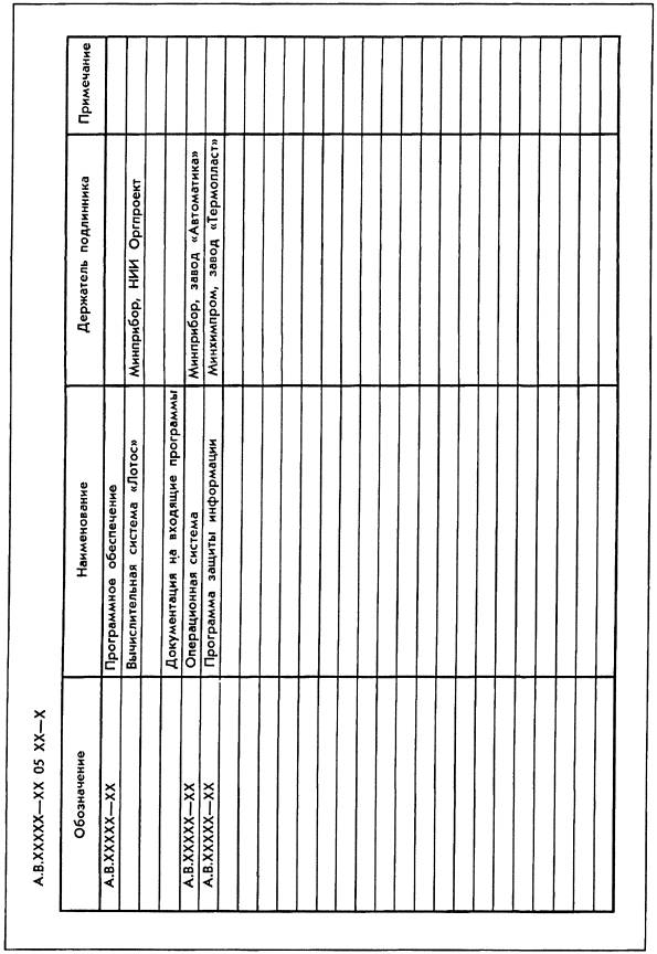 Постановлением Государственного комитета СССР по стандартам от 28 июня 1979 г. № 2335 дата введения установлена 01.07.80 1. Настоящий стандарт устанавливает форму и правила заполнения программного документа "Ведомость держателей подлинников", определенного ГОСТ 19.101-77, и обеспечивающие возможность изготовления документа машинным способом. 2. Структура и оформление документа устанавливаются в соответствии с ГОСТ 19.105-78. Составление информационной части (аннотации и содержания) является необязательным. 3. Ведомость составляют на основании спецификации программы и спецификаций входящих программ. Форма ведомости держателей подлинников приведена в приложении 1. 4. В начале ведомости записывают спецификации, подлинники которых хранятся на предприятии - держателе подлинника спецификации программ, на которую составляется ведомость. Далее записывают спецификации, подлинники которых хранятся на других предприятиях. Запись спецификаций для входящих программ производят под заголовком "Документация на входящие программы". Для ведомостей, выполненных печатным способом, в графе "Наименование" заголовок подчеркивают. Записывают спецификации без перечисления входящих в них программных и ссылочных документов. 5. Спецификации записывают в ведомости в порядке возрастания кодов организаций (предприятий) - разработчиков. 6. Графы ведомости заполняют следующим образом: в графе "Обозначение" указывают обозначение спецификаций по ГОСТ 19.103-77; в графе - "Наименование" приводят полное наименование программы в соответствии с наименованием, указанным на листе утверждения или титульном листе; в графе "Держатель подлинника" указывают ведомственную принадлежность (министерство) и, в установленном порядке, наименование организации (предприятия) - держателя подлинника. При записи организаций - держателей подлинников, относящихся к одному министерству (ведомству), в двух и более последующих строках одного листа ведомости наименование министерства (ведомства) указывают только при первом упоминании и в дальнейшем не повторяют; в графе "Примечание" указывают, при необходимости, дополнительные сведения. Пример заполнения ведомости держателей подлинников приведен в приложении 2. Обозначения и держатели подлинников в примере указаны условно. ПРИЛОЖЕНИЕ 1 ФОРМА ВЕДОМОСТИ ДЕРЖАТЕЛЕЙ ПОДЛИННИКОВ