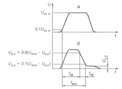 G1 - генератора отпирающих импульсов; р - измеритель временных интервалов; VS-испытуемый тиристор Черт. 1 Генератор G1 должен обеспечивать заданные значения амплитуды импульса отпирающего напряжения и прямого тока тиристора, находящегося в открытом состоянии, в соответствии с п. 2.1, при этом погрешность задания режима должна быть в пределах ±10 %. Генератор G1 должен обеспечивать заданную частоту следования, длительность импульсов и длительность фронта импульсов отпирающего напряжения в соответствии с п. 2.1. Постоянная времени цепи основного электрода должна быть не более 0,15 значения измеряемого времени. Активное сопротивление в цепи основного электрода с учетом выходного сопротивления генератора отпирающих импульсов должно быть не более указанного в стандартах или технической документации, утвержденной в установленном порядке, на тиристоры конкретных типов. Измеритель Р должен иметь погрешность измерения в пределах ±10 % максимального значения рабочей части шкалы при использовании стрелочных приборов и в пределах ±10 % значения измеряемой величины ±1 знак младшего разряда дискретного отсчета для цифровых приборов. (Измененная редакция, Изм. № 1). 3. ПРОВЕДЕНИЕ ИЗМЕРЕНИЯ3.1 Измерение времени tвкл, tир, tзд производят в следующем порядке. Тиристор подключают в измерительную установку и с помощью генератора G1 переключают его в открытое состояние. Отсчет значений измеряемых величин производят по измерителю Р. 3.2. Временные диаграммы приведены на черт. 2.