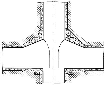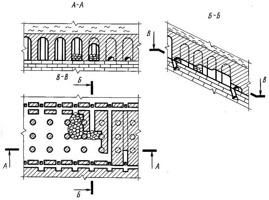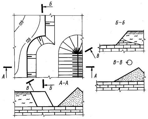 Черт. 10 3.3. Поверхность откоса насыпи (отвала, навала и др.) должна определяться линией верхнего контура (сплошная основная линия), линией нижнего контура (штрихпунктирная тонкая линия) (черт. 7) и линиями наибольшего ската. Обозначения вскрышных горных пород и полезного ископаемого на откосах насыпей аналогичны указанным в п. 3.2. 3.4. При изображении пересекающихся, примыкающих и налегающих элементов горных объектов (уступов, насыпей и др.), а также взаимопересекающихся поверхностей допускается упрощенное изображение линий пересечений, если нет необходимости детального выявления их формы (черт. 10). 3.5. При отсутствии необходимости в выделении конкретного типа горных пород или полезного ископаемого вскрышные породы в массиве могут штриховаться под углом 45° к линиям рамки чертежа с расстоянием между линиями 5 - 10 мм, а полезные ископаемые в массиве - штриховкой в другую сторону с расстоянием между линиями соответственно 2,5 - 5 мм (см. таблицу). 4. ИЗОБРАЖЕНИЕ ЭЛЕМЕНТОВ ПОДЗЕМНЫХ ГОРНЫХ ВЫРАБОТОК И СООРУЖЕНИЙ4.1. Контур сопряжения закрепленных горных выработок (горно-строительных конструкций и сооружений) следует выполнять сплошной основной линией. Упрощенный контур сопряжения следует выполнять сплошной тонкой линией (черт. 11).