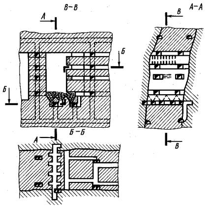 Дата введения 01.01.80 Настоящий стандарт устанавливает правила изображения элементов горных объектов на горных чертежах всех отраслей промышленности, ведущих разработку твердых полезных ископаемых. Стандарт не распространяется на геолого-маркшейдерскую документацию, а также планы земной поверхности горных предприятий, выполняемые по техническим требованиям ГУГК. 1. МЕТОДЫ ИЗОБРАЖЕНИЯ1.1. Изображения горных объектов на горных чертежах должны выполняться: по методу параллельного проецирования в прямоугольных проекциях в соответствии с ГОСТ 2.305, в аксонометрических проекциях в соответствии с ГОСТ 2.317, в проекциях с числовыми отметками, в векторных проекциях и по методу аффинных преобразований; по методу центрального проецирования (например, в линейной перспективе). 1.2. Элементы горных объектов на чертежах могут изображаться полностью (черт. 1 а), упрощенно (черт. 1 б) или условными обозначениями по ГОСТ 2.854 - ГОСТ 2.856. Если на одном виде даны полное и упрощенное изображения, то упрощенное изображение следует выполнять сплошной тонкой линией (черт. 1 а). Если приводится только упрощенное изображение, то его следует выполнять сплошной основной линией. 2. ВИДЫ, РАЗРЕЗЫ, СЕЧЕНИЯ2.1. Виды, разрезы и сечения на горных чертежах следует выполнять по правилам ГОСТ 2.305 и настоящего стандарта. 2.2. Изображение на плане для карьерных, шахтных (рудничных) полей, их отдельных участков, залежей полезных ископаемых и горных пород, а также совокупности горных выработок следует принимать на чертеже в качестве главного. Для наклонных и крутопадающих месторождений в качестве главного допускается принимать и другие изображения. Следует применять следующие планы: земной поверхности, погоризонтные, пластовые, гипсометрические, сводные и совмещенные. 2.3. Разрезы и сечения могут быть горизонтальные (погоризонтные планы), вертикальные (вкрест простирания и по простиранию залежи) и наклонные. Наклонные разрезы и сечения могут быть спроецированы на наклонную (черт. 2), горизонтальную (черт. 3) и вертикальную (черт. 4) плоскости проекций. Разрезы и сечения могут быть сложными: ступенчатые (Б - Б на черт. 5) и ломаные. 2.4. Для наклонных и крутопадающих месторождений вертикальные разрезы и сечения (по простиранию и вкрест простирания залежи) могут применяться без горизонтального разреза или с горизонтальным разрезом, который в этом случае является вспомогательным (Б - Б на черт. 5). 2.5. В соответствии с ГОСТ 2.306 допускается не штриховать весь элемент горных пород.