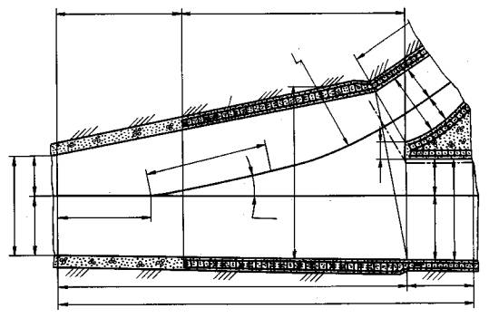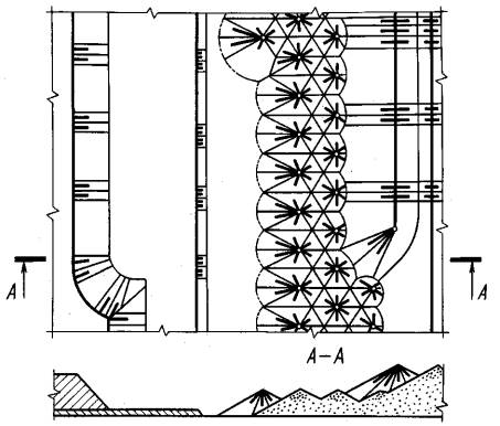 Черт. 11 4.2. Контур незакрепленных горных выработок и выработанного пространства следует изображать упрощенно и выполнять сплошной основной линией. 4.3. Внутренние контуры закрепленных горных выработок следует выполнять сплошной основной линией, а контуры в проходке - сплошной тонкой линией. 4.4. На разрезах, расположенных поперек продольной оси горной выработки, на чертежах, выполненных в масштабе 1:500 и менее, контуры горной выработки следует наполовину (по диагонали) затушевывать (см. черт. 5). 4.5. На разрезах и сечениях вскрывающих, подготовительных и нарезных горных выработок, а также систем разработки, когда типы пород и (или) полезных ископаемых не выделяются, полезное ископаемое и вмещающие породы следует обозначать в соответствии с данными таблицы. Материал крепи горных выработок в сечениях - по ГОСТ 2.306. Общие обозначения горных пород в сечениях
