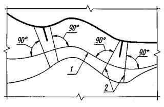 1 - горизонталь; 2 - линия наибольшего ската. Черт. 8