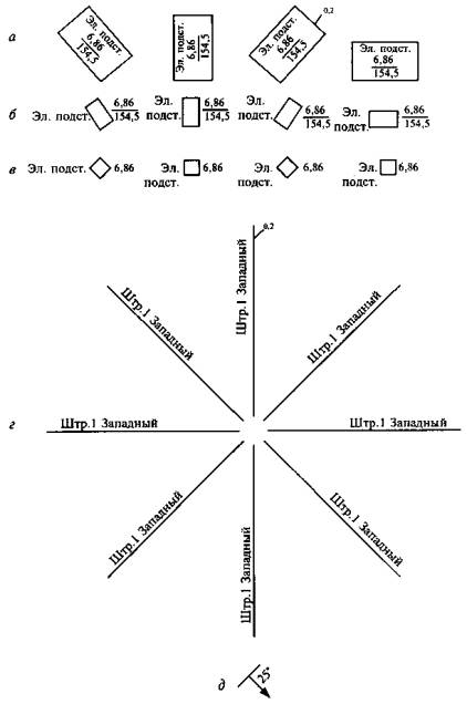 Примечание. Размеры надписей, не указанных в табл. 4, следует устанавливать по аналогии с приведенными, руководствуясь содержанием надписи, масштабом чертежа и видом условного обозначения. 10. Названия объектов, изображаемых масштабными и разномасштабными условными обозначениями, следует, как правило, указывать полностью. Если места для полного названия недостаточно, то его следует указывать в сокращенном виде. Названия объектов, изображаемых внемасштабными условными обозначениями, следует указывать в сокращенном виде. Сокращения пояснительных надписей на чертежах приведены в приложении 1. 11. Названия объектов на чертежах следует указывать с прописной буквы и размещать следующим образом: на масштабных условных обозначениях названия и цифровые данные следует помещать на площади условных обозначений, ориентируя, как показано на черт. 1, а; если надписи не помещаются внутри условного обозначения, то название следует наносить слева от условных обозначений, а цифровые данные справа, ориентируя их параллельно нижней рамке чертежа (черт. 1, б). На безмасштабных условных обозначениях названия следует указывать слева, а цифровые данные справа от условных обозначений, ориентируя их параллельно нижней рамке чертежа (черт. 1, в); на плане горных выработок на масштабных условных обозначениях названия следует помещать рядом с выработкой, ориентируя их параллельно выработке, названия стволов следует ориентировать параллельно изображению околоствольных выработок. На безмасштабных условных обозначениях названия или номера следует указывать слева, а цифровые данные справа от условных обозначений, ориентируя их параллельно изображению выработок; на всех чертежах для разномасштабных и пояснительных условных обозначений вытянутой формы названия и цифровые данные следует указывать вдоль этих обозначений, ориентируя их, как показано на черт. 1, г. Для отдельных пояснительных условных обозначений следует указывать только цифровые данные, помещая их справа от условного обозначения параллельно его контурам (черт. 1, д).