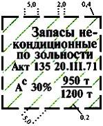 2.2. Изображение формы тел полезных ископаемых и качества полезных ископаемых Условные обозначения для изображения формы тел полезных ископаемых и качества полезных ископаемых должны соответствовать приведенным в табл. 2. В условных обозначениях 1б и 1в контурную линию с внутренней стороны следует дополнять кантом шириной 2 мм цветом, принятым для полезного ископаемого по табл. 6; на угольных месторождениях условными обозначениями 1б и 1в следует показывать выход пласта под покровные отложения (наносы). В условных обозначениях 2 вдоль границы следует указывать дату установления этой границы. На площади, ограниченной условным обозначением 3 на горно-геологических чертежах, следует указывать марку, сорт, тип полезного ископаемого и среднее содержание полезного или вредного компонента в общепринятых обозначениях и единицах измерения. В условном обозначении 4б следует указывать название границы («граница зоны окисления», «граница зоны выщелачивания», «граница зоны вторичного обогащения»). На площади, ограниченной условным обозначением 5, следует наносить одно из условных обозначений 15 - 18. На площади условного обозначения 9 или вне этой площади (при малых ее размерах) следует указывать в числителе - номер акта, причину и дату списания и количество списанных запасов полезного ископаемого в тоннах, в знаменателе - количество запасов на списываемом участке в тоннах по данным учета балансовых запасов. Условные обозначения 12 следует наносить на планы горных выработок по откаточным горизонтам, на разрезы и планы горных выработок по участкам или этажам, при разработке свиты крутопадающих пластов. Условное обозначение 13 вместо точек следует заполнять условным обозначением породы, если определена порода в зоне замещения. На условное обозначение 14 следует наносить условные обозначения воды, если карст заполнен водой, или породы, если карст заполнен породой; если карст полый, то площадь условного обозначения заполнять не следует, приводя надпись «Карст». В условных обозначениях 15 - 17 следует указывать изменившуюся мощность пласта в метрах, а в условном обозначении 18 - амплитуду флексуры в метрах. Условные обозначения 19 и 20 следует наносить в центре площади блока подсчета запасов. В условном обозначении 20 в числителе следует указывать площадь блока в квадратных метрах и среднюю мощность тела полезного ископаемого, в знаменателе - среднее содержание полезного компонента и запасы полезного ископаемого в блоке в тысячах тонн; для угольных и сланцевых месторождений вместо среднего содержания полезного компонента следует указывать зольность в процентах. Участки с запасами, переведенными из балансовых в забалансовые, на чертежах следует ограничивать условным обозначением 8б, указывая номер и дату акта по переводу запасов из одной категории в другую. В условных обозначениях 21 и 22 следует указывать номер пробы, образца или испытания и результаты по пробе, образцу или испытанию (например, зольность А° или плотность gv). В условном обозначении 23 следует указывать температуру. Условные обозначения 25 следует наносить на площадь условного обозначения выработанного пространства на расстоянии друг от друга не менее расстояния, соответствующего квартальному подвиганию, размещая их перпендикулярно изображению вентиляционного и откаточн