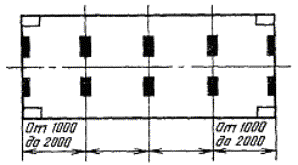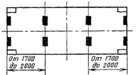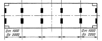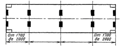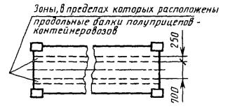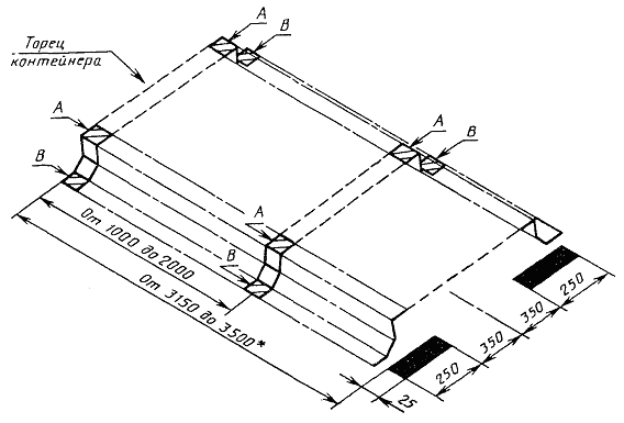 Черт. 8 Примечание. Высота трех подкладок по 50 мм. Под свободный угол контейнеров типоразмеров УУКП-5 (6), УУКП-5, УУК-5 (6) и УУК-5 устанавливается дополнительная подкладка высотой 35 мм. (Измененная редакция, Изм. № 3). Установка контейнера на продольное ребро