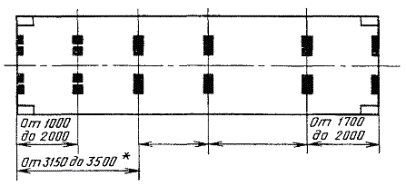 Черт. 2 Расположение опорных (контактных) площадок в основании контейнеров типоразмеров 1АА, 1А и 1AX, не имеющих паза для установки на полуприцеп с «гусиной шеей» а) при 5 парах опорных (контактных) площадок (минимум)