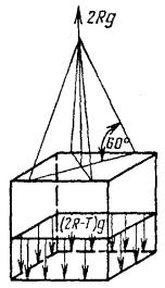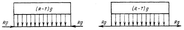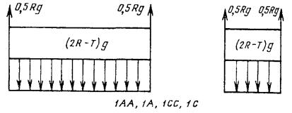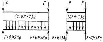 Черт. 9 Примечание. Груз в контейнере должен иметь массу R-Т. ПРИЛОЖЕНИЕ 3Обязательное ЗНАЧЕНИЯ СИЛ И СХЕМЫ ИХ ДЕЙСТВИЯ НА КРУПНОТОННАЖНЫЕ КОНТЕЙНЕРЫ ПО ГОСТ 18477На чертежах буквами обозначены: R - максимальная масса брутто контейнера, кг; Т - его собственная масса, кг; g - ускорение силы тяжести, g = 9,81 м/с2. Показанные наружные нагрузки относятся только к одной конструктивной части (угловому фитингу, вилочному проему, подхватному устройству), внутренние - к контейнеру в целом. Нагрузки, условия их приложения и другие указания, относящиеся к контейнерам типоразмеров 1АА (1А), 1СС (1C) и 1D, распространяются также на контейнеры типоразмеров 1АХ, 1СХ и 1DX. Нагрузки и схемы их действия, указанные на черт. 1 - 14, принимаются при проектировании и испытаниях контейнеров, а на черт. 15 - 17 - только при проектировании. 1. Штабелирование F = 848 кН для 1АА, 1А, 1АХ, 1СС, 1C, 1СХ; F = 224 кН для 1D, 1DX. Черт. 1 Примечания: 1. Силы, приложенные к верхним угловым фитингам, смещены относительно центров последних на 38 мм в продольном и на 25 мм в поперечном направлениях. 2. По согласованию между изготовителем и заказчиком нагрузка F для контейнеров типоразмеров 1АА, 1А, 1АХ может быть увеличена до 1077 кН. 2. Подъем за верхние угловые фитинги