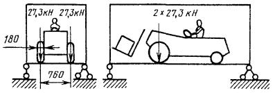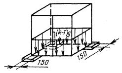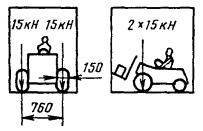 Черт. 7 Примечание. Площадь контакта шины каждого из двух передних колес погрузчика с полом контейнера равна 40 см2. 8. Проверка жесткости конструкции Установка контейнера на 3 опоры
