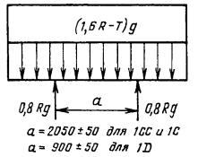 Черт. 4 Примечание. Силы, приложенные к нижним угловым фитингам, должны отстоять от их наружной поверхности на 38 мм. 4. Подъем контейнеров, имеющих вилочные проемы, вилочным погрузчиком Подъем контейнеров типоразмеров 1СС, 1C и 1D с одной парой вилочных проемов и контейнеров типоразмеров 1СС, 1C с двумя парами проемов с использованием внешней пары. Черт. 5 Подъем контейнеров типоразмеров 1СС и 1C с двумя парами вилочных проемов с использованием внутренней пары: Черт. 6 Примечание. Вилочный захват погрузчика (ширина вил по 200 мм) вводится в пазы на длину 1828 ± 3 мм. До 01.07.89 по согласованию между изготовителем и заказчиком допускается снижать указанные на черт. 5 и 6 нагрузки: (1,6 R - Т) g до (1,25 R - T) g; 0,8 Rg до 0,0625 Rg; (0,8 R - Т) g до (0,625 R - Т) g; 0,4 Rg до 0,3125 Rg. 5. Подъем за подхватные устройства основания (если они имеются)