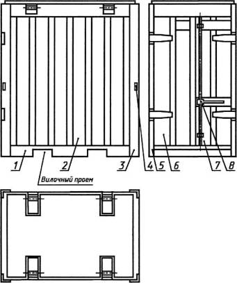 1 - основание (нижняя рама); 2 - боковая стенка; 3 - торцовая стенка; 4 - устройство для крепления контейнера на подвижном составе; 5 - дверная рама; 6 - левая створка двери; 7 - правая створка двери; 8- запорное устройство Примечание. Чертеж не определяет конструкции контейнера. Основание может быть образовано при сборке контейнера. 2.4. Несущие элементы конструкции контейнера, кроме рымных узлов, следует изготовлять из стали марок ВСт3сп2, ВСт3пс2 или ВСт3Гпс2 по ГОСТ 380-94 или из стали других марок, не уступающей по своим характеристикам стали указанных марок. Рымные узлы - по ГОСТ 18579-79. 2.5. Несущие элементы конструкции контейнера, кроме рымных узлов, должны быть изготовлены из холодногнутых профилей. При этом балки нижней и верхней рам, боковых и торцевых стенок должны быть выполнены из швеллера 160´50´3 мм по ГОСТ 8278-83, нижние балки дверной рамы - из специального швеллера 120´160´103´84´3 мм по техническим условиям на профили, стенки - из гофрированного листа толщиной 1,5 мм (высота трапециевидных гофров - 31,5 мм, шаг между ними - 300 мм) и угловые стойки - из специального корытного профиля 110´45´30´25´3 мм по техническим условиям на профили. 2.4, 2.5. (Измененная редакция, Изм. № 3, 4). 2.6. Каркас дверных створок должен быть изготовлен из неравнополочного швеллера 50´68´42´3 мм по техническим условиям на профили. Примечание. Допускается замена сечений холодногнутых профилей, указанных в пп. 2.5 и 2.6 другими при условии, что качественные показатели контейнера, включая прочность и жесткость конструкции, не будут ухудшены, что должно подтвердиться результатами типовых испытаний по ГОСТ 20260-80. (Измененная редакция, Изм. № 1, 4). 2.7. Петли створок дверей должны быть литой или штампованной конструкции. По согласованию с МПС допускается петли выполнять сварной конструкции из листа толщиной 5 мм по ГОСТ 19903-74. (Измененная редакция, Изм. № 2, 3). 2.8. Запорные устройства контейнера должны изготовляться в соответствии с требованиями ГОСТ 20259-80 и с применением унифицированных для среднетоннажных контейнеров деталей (штанг, кронштейнов, кулачков, рукояток, пломбировочных скоб). Штанги запорных устройств контейнеров разных типоразмеров могут отличаться между собой только по высоте. Кронштейны и кулачки могут быть литыми или штампованными. 2.9. Пол контейнера должен изготовляться из досок толщиной 35 мм по ГОСТ 8486-86 или из фанеры толщиной не менее 20 мм марок ФП-1 и ФО-1, предназначенной для авто-, вагоно-, контейнеростроения, по техническим условиям на фанеру. Требования к древесине - по ГОСТ 20259-80. Допускается по разрешению МПС применение досок толщиной 28 мм при обеспечении изготовителем контейнеров сплошной проверки досок на соответствие ГОСТ 20259-80 и ГОСТ 8486-86. Для обеспечения водонепроницаемости дощатого пола доски его или собираемые из них щиты должны плотно стыковаться между собой в четверть, окрашиваться с обеих сторон (при антисептировании - только снаружи) и укладываться на металлические элементы основания без сквозных щелей по всему периметру. 2.8, 2.9. (Измененная редакция, Изм. № 4). 2.10. Кровля крыши должна быть изготовлена из тонколистовой прокатной стали толщиной листа 1,5 мм по ГОСТ 19903-74 и ГОСТ 19904-90. 2.11. Кровлю крыши, обшивку стенок и створок двери допускается изготовлять составными. Листы кровли должны стыковаться на несущих элементах конструкции. Сварные швы должны быть ровными, плотны