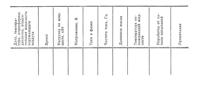 Для электроагрегатов и электростанций, допускающих возможность параллельной работы, рекомендуется через каждые 200 ч наработки в течение одной смены (8 ч) проводить параллельную работу электроагрегатов или электростанций с промышленной сетью или между собой. 2.2.2.7. Испытания электроагрегатов и электростанций на безотказность должны проводиться в условиях (температура, влажность, атмосферное давление), имеющихся на испытательной станции (полигоне) и не выходящих за пределы, установленные ГОСТ 23377-84. 2.2.2.8. При проведении испытаний на безотказность в длительном режиме с переменной нагрузкой ежесменно контролируют: нагрузку по мощности; напряжение и ток в фазах; частоту тока; температуру окружающей среды; атмосферное давление; относительную влажность окружающей среды; давление масла в двигателе; температуру охлаждающей жидкости и масла в двигателе. В конце и в начале испытаний измеряют расход топлива, потребляемого двигателем при его работе в номинальном режиме. 2.2.2.9. Во время испытаний на безотказность на каждый электроагрегат или электростанцию заводят журнал, в который заносят: наименование электроагрегата или электростанции, ее условное обозначение, заводской номер, год, месяц выпуска, предприятие-изготовитель; контролируемые параметры; состояние электроустановки (автономная работа, вид технического обслуживания, ремонта и т. д.); число часов работы нарастающим итогом; дату начала и окончания технического обслуживания, ремонта; трудоемкость технического обслуживания, ремонта; продолжительность и причину вынужденного простоя в ожидании технического обслуживания, ремонта; стоимость проведения технического обслуживания, ремонта (включая стоимость замененных деталей, а также отремонтированных, при этом отдельно указать стоимость деталей, использованных из комплекта запасных инструментов и принадлежностей); перечень регулировочных (наладочных) работ по восстановлению электроагрегатов или электростанций и их составных частей; рекомендации и предложения обслуживающего персонала по предотвращению подобных отказов и по улучшению удобства проведения технического обслуживания и ремонта; 2.2.2.10. Контрольные испытания на безотказность допускается прерывать. Основанием для перерыва может быть: выход из строя стендов и вспомогательного оборудования; отсутствие средств обеспечения; устранение последствий аварии; возникновение условий, угрожающих сохранности электроагрегатов или электростанций и безопасности обслуживающего персонала или нарушающих установленный режим испытаний более чем на 2 рабочих суток. 2.2.2.11. Контрольные испытания на безотказность могут быть досрочно прекращены. Основанием для такого прекращения может быть несоответствие надежности электроагрегатов или электростанций заданным требованиям. 2.2.3. Контрольные испытания на ремонтопригодность 2.2.3.1. Контрольные испытания на ремонтопригодность проводят для оценки соответствия электростанции или элекгроагрегата требованиям к среднему времени восстановления работоспособного состояния. 2.2.3.2. Контрольные испытания на ремонтопригодность должны проводиться на вновь разрабатываемых электроагрегатах и электростанциях. 2.2.3.3. Программу и методику испытаний на ремонтопригодность допускается включать разделом в общую программу и методику исп