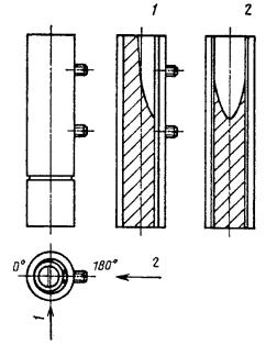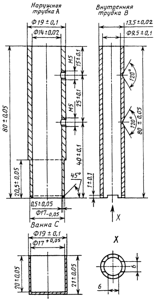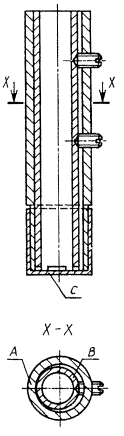где Sп - площадь пор, мм2 (суммарная площадь газовых пор и участков несмачивания). 1.17. Величины Sз и Sп должны измеряться приборами, обеспечивающими погрешность измерения не более 0,5 мм2, на снимке, полученном после рентгеновского просвечивания образцов, или непосредственно на образце после удаления одной из пластин механической обработкой. 1.18. За значения Kз и Kп должны приниматься среднеарифметические значения трех полученных результатов. (Измененная редакция, Изм. № 2). 2. МЕТОД ОПРЕДЕЛЕНИЯ ЗАТЕКАНИЯ ПРИПОЯ В ВЕРТИКАЛЬНЫЙ ЗАЗОР 2.1. Для испытаний следует применять образец, состоящий из двух трубок А и В из паяемого материала в соответствии с черт. 1. 2.2. Образец перед испытанием должен быть собран в соответствии с черт. 2. Материал винтов и ванны должен иметь температуру начала плавления выше температуры пайки и не вступать во взаимодействие с паяемым материалом и припоем. 2.3. Подготовка внутренней поверхности трубки А, наружной поверхности трубки В и припоя должна соответствовать технологическому процессу подготовки поверхности паяемого изделия перед пайкой. 2.4. Припой кусками размером от 15 до 20 мм должен быть введен в отверстие внутренней трубки В. Объем припоя - не более 1400 мм3. 2.5. Испытания следует проводить с флюсом или в среде, применяемой в соответствующем технологическом процессе пайки. 2.6. Установка для испытаний должна обеспечивать нагрев образца и припоя до температуры пайки и сохранение ее при испытании. 2.7. Режим нагрева и охлаждения образца должен быть задан программой испытания, соответствующей условиям нагрева и охлаждения изделия. 2.8. Измерение и автоматическую запись температуры следует проводить термоэлектрическими преобразователями и автоматическими приборами следящего уравновешивания по ГОСТ 7164 класса точности не ниже 0,5. 2.9. Испытаниям следует подвергать не менее трех образцов. 2.10. Высоту подъема в зависимости от зазора следует измерять на снимке, полученном после рентгеновского просвечивания образцов, или непосредственно на разрезанном образце. Просвечивание или резы образца должны проводить в двух осях в направлениях 1 и 2 в соответствии с черт. 3. 2.11. Высоту подъема должны измерять приборами, обеспечивающими погрешность измерения не более 0,5 мм. 2.12. За значение высоты подъема припоя следует принимать среднеарифметическое значение трех полученных результатов. Разд. 2. (Измененная редакция, Изм. № 2). Черт. 1 Черт. 2 Черт. 3 Результаты испытаний должны быть оформлены протоколом испытаний, в котором должны быть указаны: 1) марка или химический состав паяемых материалов; 2) марка или химический состав припоя; 3) способ подготовки паяемого материала и припоя; 4) среда испытания, марка или химический состав флюса или газовой среды; 5) источник нагрева; 6) температура испытания, °С; 7) время нагрева до температуры пайки; 8) время выдержки при температуре пайки; 9) время охлаждения до температуры 20 °С; 10) результаты испытаний или график зависимости высоты подъема от величины зазора. Разд. 3. (Введен дополнительно, Изм. № 2). ИНФОРМАЦИОННЫЕ ДАННЫЕ 1. РАЗРАБОТАН И ВНЕСЕН Государственным комитетом СССР по стандартам РАЗРАБОТЧИКИ И.Г. Нагапетян (руководитель темы), М.М. Калинин 2. УТВЕРЖДЕН И ВВЕДЕН В ДЕЙСТВИЕ Постановлением Государственного комитета СССР по стандартам от 7 февраля 1975 г. № 350 3. Стандарт полностью соответствует СТ 