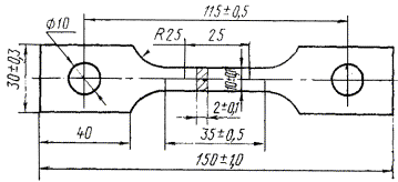 Постановлением Государственного комитета стандартов Совета Министров СССР от 7 февраля 1975 г. № 352 срок действия установлен с 01.01.1976 г. до 01.01.1981 г. Несоблюдение стандарта преследуется по закону Настоящий стандарт устанавливает метод статических испытаний на растяжение при температуре пайки для оценки влияния жидкого припоя на механические свойства паяемого материала по изменению следующих характеристик: временного сопротивления разрыву; относительного удлинения после разрыва. 1. ОПРЕДЕЛЕНИЯ И ОБОЗНАЧЕНИЯ1.1. Устанавливаются следующие определения понятий и обозначения: а) рабочая длина образца l, мм - часть образца с постоянной площадью поперечного сечения между участками для захвата; б) начальная расчетная длина образца до разрыва l0, мм - участок образца, на котором определяется удлинение; в) конечная расчетная длина образца lк, мм - длина расчетной части после разрыва; г) начальная площадь поперечного сечения рабочей части образца F0, мм2; д) временное сопротивление разрыву sвт, кгс/мм2 - напряжение, соответствующее наибольшей нагрузке Pmax, при температуре пайки, предшествующей разрушению образца; е) относительное удлинение после разрыва при температуре пайки δт, % - отношение приращения расчетной длины образца (lк - l0) к его начальной длине; ж) показатель влияния припоя на прочностные свойства материала Ks, % - отношение величины изменения временного сопротивления материала в контакте с жидким припоем к величине временного сопротивления без припоя на поверхности; з) показатель влияния припоя на пластические свойства материала Kδ, % - отношение величины изменения относительного удлинения материала в контакте с жидким припоем к величине относительного удлинения материала без припоя на поверхности. 2. ФОРМА И РАЗМЕРЫ ОБРАЗЦОВ2.1. Для испытаний следует применять плоские образцы с начальной расчетной длиной l0 = 25 мм. 2.2. Форма и размеры образцов должны соответствовать указанным на чертеже.