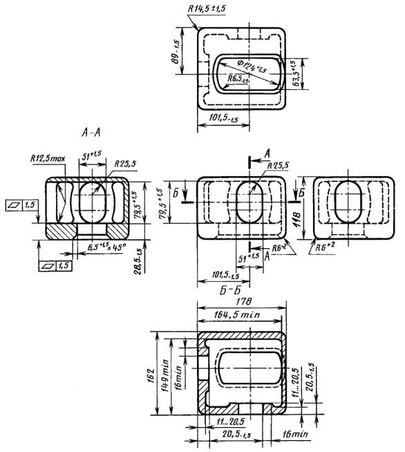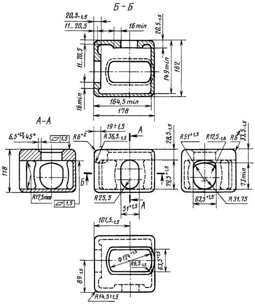 Постановлением Государственного комитета СССР по стандартам от 31 марта 1982 г. № 1365 дата введения установлена 01.01.83 Ограничение срока действия снято по протоколу № 2-92 Межгосударственного совета по стандартизации, метрологии и сертификации (ИУС 2-93) 1. Настоящий стандарт распространяется на угловые фитинги крупнотоннажных контейнеров (далее - фитинги). Стандарт не распространяется на фитинги авиационных контейнеров. Фитинги, являющиеся несущими элементами конструкции крупнотоннажных контейнеров, должны обеспечивать надежную и безопасную перевозку, погрузку, выгрузку и перегрузку контейнеров, крепление их на транспортных средствах, а также соединение контейнеров между собой при штабелировании. Настоящий стандарт устанавливает конструктивные исполнения, основные размеры и технические требования для изготовления и приемки фитингов. Стандарт полностью соответствует международным стандартам ИСО 1161-84, СТ СЭВ 3343-81. Фитинги должны отвечать действующим правилам Регистра по контейнерам. (Измененная редакция, Изм. № 1). 2. В зависимости от места расположения установлены следующие исполнения фитингов: верхний правый, верхний левый, нижний правый, нижний левый (правые и левые фитинги определяются при размещении наблюдателя лицом против любой торцевой стенки контейнера). Расположение фитингов на контейнере должно соответствовать приложению 1. 3. Пример условного обозначения верхнего правого углового фитинга крупнотоннажного контейнера: Фитинг ВП ГОСТ 20527-82 То же, нижнего левого фитинга: Фитинг НЛ ГОСТ 20527-82 4. Климатическое исполнение фитингов - У, категория 1 по ГОСТ 15150-69 для эксплуатации в диапазоне предельных температур 223 К - 343 К (минус 50 °С - плюс 70 °С). 5. Конструкция и размеры фитингов должны соответствовать указанным на черт. 1, 2 и рабочим чертежам, утвержденным в установленном порядке. Допускается изготовлять фитинги с габаритными размерами 180´162´120 мм. Левые фитинги являются зеркальным отражением правых, размеры их идентичны. Допускается изготавливать фитинги открытыми со сторон, прилегающих к контейнеру (черт. 1 и 2). Фитинг верхний правый Черт. 1 Примечание. Предельные отклонения габаритных размеров - по ГОСТ 26645-85. Фитинг нижний правый Черт. 2 Примечание. Предельные отклонения габаритных размеров - по ГОСТ 26645-85. (Измененная редакция, Изм. № 1). 6. Наружные и внутренние радиусы закруглений, не указанные на черт. 1 и 2, должны быть 3-1,5 мм. Допускается вместо закруглений выполнять фаски 2+1´45°. 7. Допускается на черт. 1 и 2 вместо радиуса 6+2 мм выполнять фаску 4+2 ´ 45° и вместо фаски 6,5+1´45° выполнять фаску (6,5 ± 1,5)´45°. 8. Соединение двух наружных закруглений фитингов радиусами 6 и 14,5 мм следует осуществлять плавным переходом дуги одного радиуса в дугу другого радиуса, а при выполнении фасок обеспечивать плавное скругление от фасок 4+2´45° к радиусу 14,5 мм с минимальным снятием металла. 9. Поверхности фитингов, привариваемые к элементам конструкции контейнера (угловым стойкам, продольным и поперечным балкам), должны быть подготовлены под сварку по соответствующей нормативно-технической документации. Остальные наружные и все внутренние поверхности фитингов, а также поверхности их отверстий должны быть пригодными для безопасного выполнения подъемно-транспортных и крепежных операций. Горизонтальная опорная поверхность на внутренней стороне ве
