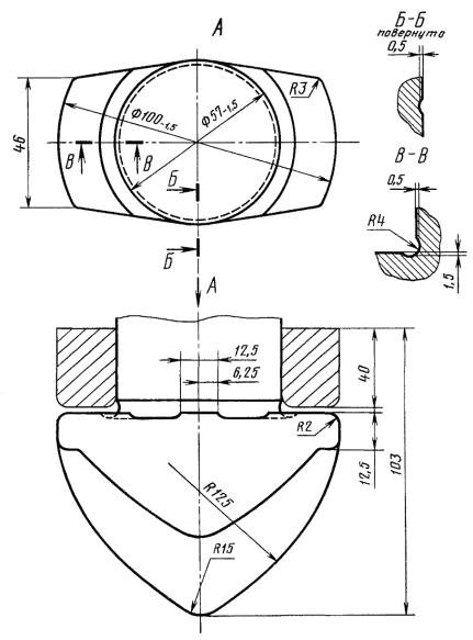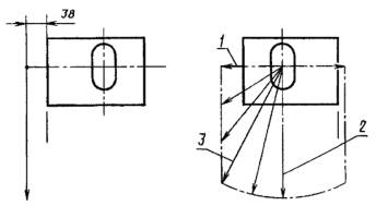Схема действия сил на фитинг при транспортировании контейнеров, закрепленных на палубе судна 1 - горизонтальная составляющая 150 кН; 2 - вертикальная составляющая 300 кН; 3 - предельные силы в зоне их приложения Черт. 3 Фитинг нижний (вид снизу) Черт. 4 Примечание к черт. 4. Заштрихована поверхность приложения силы. 12.1. Схемы действия сил на контейнеры - по ГОСТ 20259-80. 12.2. Схема действия сил на фитинг при транспортировании контейнеров, закрепленных на палубе судна, указана на черт. 3. Силу прилагают поочередно к торцевым и боковым стенкам фитинга, параллельно их наружным поверхностям на расстоянии не более 38 мм. 12.3. Значения сил, действующих на фитинги при штабелировании, даны применительно к шестиярусному штабелированию контейнеров с максимальной массой брутто одного контейнера 30480 кг. При штабелировании более чем в шесть ярусов значения сил должны быть рассчитаны по формулам: