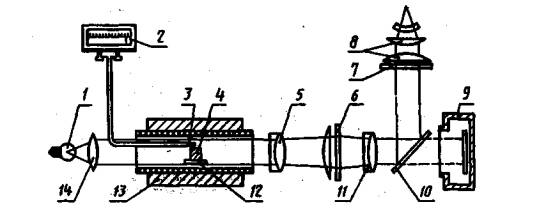 1-первоначальная форма образца; 2-форма образца при температуре tА; 3-форма образца при температуре tВ; 4- форма образца при температуре tС Рисунок 3. Изменение формы образца при нагревании Примечание. Для больших образцов желательна меньшая скорость нагревания; для меньших образцов скорость повышения температуры до 10оС/мин может быть достаточной. 7.2 Микроскопо-фотографический методПри использовании фотографической камеры на подставке собирают установку, приведенную на рисунке 4.