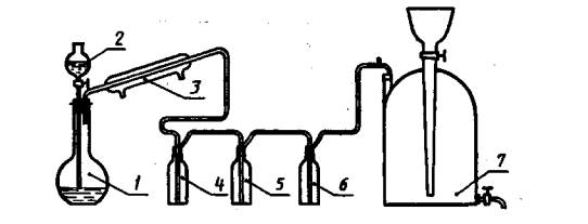 1-круглодонная колба; 2-капельная воронка; 3-холодильник; 4-промывная склянка; 5 и 6-склянки с пирогаллолом; 7-газометр. Рисунок 1А - Установка для получения оксида углерода В круглодонную колбу наливают концентрированную серную кислоту и нагревают на водяной бане до 60-80ºС. В воронку наливают 25%-ный раствор муравьиной кислоты. К подогретой серной кислоте медленно, по каплям, приливают муравьиную кислоту. Температуру серной кислоты постепенно повышают до тех пор, пока не начнется выделение газа (оксид углерода). Скорость выделения газа регулируют скоростью подачи муравьиной кислоты и температурой подогрева. По окончании выделения газа подогрев прекращают. Образующиеся в процессе реакции пары воды и муравьиной кислоты поступают вместе с оксидом углерода в холодильник; конденсируются и возвращаются в реакционную колбу. Оксид углерода для очистки от диоксида углерода и кислорода поступает в промывную склянку с раствором щелочи и склянки с раствором пирогаллола, а затем в газометр. Для получения газа, свободного от примеси воздуха, находящегося в системе, первую порцию газа в количестве, ровном 5-10-кротнаму объему системы, выпускают в атмосферу, соблюдая при этом осторожность ввиду токсичности оксида углерода.