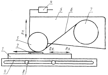 где m - масса песка, израсходованная на истирание, кг; h - толщина покрытия, мкм. За результат испытания принимают среднее арифметическое результатов не менее трех определений. Отклонение значений единичных измерений от среднего арифметического не должно превышать 10 %. Результат округляют до второго десятичного знака. (Измененная редакция, Изм. № 3). 2. МЕТОД Б2.1. Сущность метода Сущность метода заключается в определении потери массы лакокрасочного покрытия в граммах в результате истирания поверхности покрытия движущейся лентой шлифовальной шкурки при заданной нагрузке на образец. Метод применяется для покрытий толщиной не менее 40 мкм. (Новая редакция, Изм. № 3). 2.2. Аппаратура и материалы 2.2.1. Устройство для определения прочности покрытия к истиранию шлифовальной шкуркой типа УИЛ-2 по ТУ 6-23-10-89 (черт. 2): скорость движения ленты шлифовальной шкурки, м/мин 1,55; скорость перемещения столика, м/мин 0,15; нагрузка на образец, кгс 0,5 - 2. Схема устройства 1 - столик; 2 - образец; 3 - лентопротяжный ролик; 4 - сменные грузы; 5 - головка с лентопротяжным механизмом; 6 - лента шлифовальной шкурки; 7 - кассета; 8 - устройство для установления длины хода столика; 9 - шкала Черт. 2 Работа устройства заключается в том, что истирание образца под заданной нагрузкой проводится движущейся шлифовальной лентой при одновременном перемещении столика с образцом в противоположном направлении. (Измененная редакция, Изм. № 3). 2.2.2. Шкурка шлифовальная на бумажной основе марки (ГОСТ 6456-82), рулонная, с абразивом - электрокорунд нормальный, марки 14А, зернистостью М-40. Допускается применять ленту абразивную типа ЛНБ (ГОСТ 12439-79), изготовленную из указанной шлифовальной шкурки. 2.2.3. Стекло для фотографических пластинок 6,5´9/1.2 по ГОСТ 683-85. Пластинки металлические из листовой стали по ГОСТ 16523-89 или ГОСТ 9045-80 и черной жести по ГОСТ 13345-85, размером 70´100 мм толщиной не более 1 мм. Пластинки не должны быть изогнутыми. Допускаются пластинки из другого материала и другого размера в соответствии с требованиями нормативно-технической документации на испытуемый материал. (Измененная редакция, Изм. № 1, 2, 3). 2.2.4. Контрольная пластинка из цинкового листа марки Ц0 (ГОСТ 598-90) размером 70´100 мм, толщиной 1 мм, с числом твердости по Брюнеллю НВ2,5/15,6/60 в пределах 20 - 35 для определения истирающей способности шлифовальной шкурки (прилагается к устройству). (Новая редакция, Изм. № 3). 2.2.5. Весы лабораторные с наибольшим пределом взвешивания 200 г и пределами допускаемой погрешности ±0,0002 г. 2.2.6. Средство измерения толщины покрытия с погрешностью не более 5 %. 2.2.7. Кисть мягкая волосяная. 2.2.5 - 2.2.7. (Введены дополнительно, Изм. № 3). 2.3. Подготовка к испытанию 2.3.1. Образцы лакокрасочных покрытий получают по п. 1.3.1, но при этом толщина покрытия должна быть такой, чтобы покрытие при испытании не истиралось до подложки (не менее 40 мкм). 2.3.2. Условия выдержки покрытия перед испытанием - по п. 1.3.2. 2.3.3. (Исключен, Изм. № 3). Допускается получать свободную пленку с пластинки из фторопласта-4 или другим методом в соответствии с требованиями нормативно-технической документации на испытуемый материал. 2.3.4. Часть рулона шлифовальной шкурки длиной примерно 15 м разрезают на специальном приспособлении (см. рекомендуемое приложение 1) на ленты шириной (15 ± 0,2) мм. При необходимости рулон предварительно разрезают по ширине на 2 - 3 части с допускаемым отк