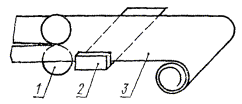 1 - нож дисковый; 2 - упор стола; 3 - шкурка шлифовальная Конструкция приспособления должна обеспечивать возможность нарезания из рулонной шлифовальной шкурки ленты шириной (15 ± 0,2) мм. Нарезание осуществляется двумя дисковыми ножами 1 с прижимными резиновыми роликами, вращающимися во встречном направлении друг к другу посредством двух шестерен и вала с рукояткой. Приспособление снабжено столиком для направленной подачи шкурки, имеющим боковой упор 2, к которому прикрепляется сменная стеклянная вставка, находящаяся в пазу плоскости столика. ПРИЛОЖЕНИЕ 2