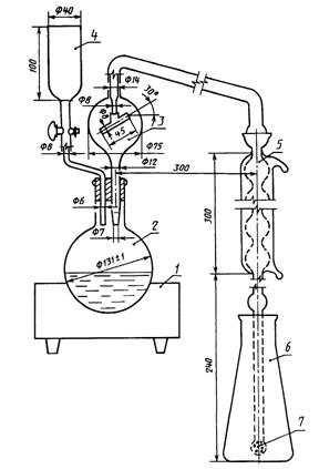 1 - колбонагреватель; 2 - реакционная колба вместимостью 0,5 - 1,0 дм3; 3 - каплеуловитель; 4 - капельная воронка с краном; 5 - холодильник; 6 - приемник; 7 - барбатер Шпатель 2(3) или ложка 2(3) по ГОСТ 9147. Секундомер. Воронка типа В-36-80 ХС по ГОСТ 25336 или полая грушевидная стеклянная пробка. Натрия гидроокись по ГОСТ 4328, растворы с массовой долей 40 % и концентрации с (NaOH) = 0,5 моль/дм3, стандартизуют по ГОСТ 25794.1. Кислота серная по ГОСТ 4204, концентрированная и раствор концентрации с (1/2 H2SO4) = 0,5 моль/дм3. Метиловый красный (индикатор), спиртовый раствор с массовой долей 0,2 %. Метиленовый голубой (индикатор), спиртовый раствор с массовой долей 0,1 %. Бромкрезоловый зеленый (индикатор), водно-спиртовый раствор с массовой долей 0,1 %; готовят по ГОСТ 4919.1. Индикатор смешанный с рН 5,1 готовят по ГОСТ 4919.1 смешиванием спиртового раствора метилового красного и водно-спиртового раствора бромкрезолового зеленого. Допускается использовать смешанный индикатор с рН 5,4, приготовленный по ГОСТ 4919.1 смешением спиртовых растворов метилового красного и метиленового голубого. Медь сернокислая по ГОСТ 4165. Спирт этиловый ректификованный технический по ГОСТ 18300. Вода дистиллированная по ГОСТ 6709. Допускается использовать деионизованную воду, удовлетворяющую требованиям ГОСТ 6709. 4.3.2.2. Проведение анализа Около 5,0000 г карбамида помещают в круглодонную колбу (см. чертеж), добавляют 25 см3 воды, 50 см3 концентрированной серной кислоты, 0,75 г сернокислой меди и закрывают колбу стеклянной воронкой или грушевидной стеклянной пробкой. Содержимое колбы перемешивают и осторожно нагревают на электроплитке или колбонагревателе до прекращения бурного выделения пузырьков углекислого газа. Нагрев увеличивают до слабого кипения жидкости и продолжают нагревать до полного прекращения выделения отдельных пузырьков углекислого газа и появления белых паров серной кислоты. Затем нагревают еще 20 мин, после чего содержимое колбы охлаждают, осторожно добавляют 300 см3 воды, вновь охлаждают до комнатной температуры, количественно переносят в мерную колбу, доводят до метки водой и перемешивают. В круглодонную колбу прибора для отгонки аммиака помещают 50 см3 полученного раствора анализируемой пробы, добавляют около 300 см3 воды и несколько «кипелок» для предотвращения толчков при кипении. Колбу соединяют через каплеуловитель с холодильником и приемником. Из бюретки в приемник наливают 40 см3 раствора серной кислоты концентрации с (1/2 NaOH) = 0,5 моль/дм3, добавляют 3 - 4 капли смешанного индикатора и около 80 см3 воды, чтобы барботер был закрыт жидкостью. Из капельной воронки в круглодонную колбу осторожно приливают 50 см3 раствора гидроокиси натрия с массовой долей 40 %, оставив при этом некоторый объем гидроокиси натрия в воронке над краном (при необходимости можно промыть воронку 50 см3 воды, сливая ее в колбу и оставляя при этом в воронке 20 - 25 см3 раствора). Колбу нагревают до кипения и кипятят до тех пор, пока объем жидкости в приемнике не станет равным примерно 300 см3. После окончания отгонки приемник с холодильником отсоединяют, холодильник промывают водой, сливая промывные воды в приемник. Избыток кислоты в приемнике при перемешивании оттитровывают раствором гидроокиси натрия концентрации с (NaOH) = 0,5 моль/дм3 до перехода фиолетовой окраски в зеленую. Одновременно проводят контрольный опыт в тех же условиях и с теми 