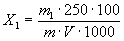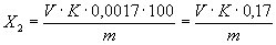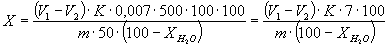 где V1 - объем раствора гидроокиси натрия концентрации с (NaOH) = 0,5 моль/дм3, израсходованный на титрование избытка кислоты в контрольном опыте, см3; V2 - объем раствора гидроокиси натрия концентрации с (NaOH) = 0,5 моль/дм3, израсходованный на титрование избытка кислоты в анализируемой пробе, см3; К - коэффициент поправки для приведения действительной концентрации раствора гидроокиси натрия к номинальной; 0,007 - масса азота, соответствующая 1 см3 раствора гидроокиси натрия концентрации с (NaOH) = 0,5 моль/дм3, г; т - масса навески карбамида, г;
