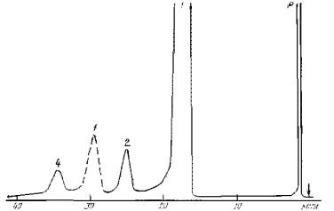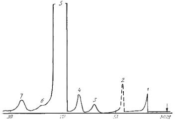 3. ПРОВЕДЕНИЕ АНАЛИЗА3.1. Навеску 0,8 - 1,5 г анализируемой пробы взвешивают в стаканчике или колбе со шлифом. В ту же емкость добавляют соответствующие анализируемым продуктам «внутренние эталоны» в граммах, составляющие 0,5 - 1,2 % массы пробы м-крезола для фенола и 0,2 - 0,8 % додекана для о-крезола. Результаты всех взвешиваний в граммах записывают с точностью до четвертого десятичного знака. Затем к подготовленной пробе фенола добавляют 0,3 - 0,6 см3 растворителя. о-Крезол с «внутренним эталоном» не растворяют. 3.2. Пробу отбирают микрошприцем, вводят в хроматограф и хроматографируют при условиях, указанных в п. 2.4.1. 3.3. Типовые хроматограммы фенола и о-крезола представлены на черт. 1 и 2. Типовая хроматограмма фенола 1 - фенол; 2 - о-крезол; 3 - м-крезол («внутренний эталон»); 4 - 2,6-ксиленол; Р - растворитель Черт. 1 Типовая хроматограмма о-крезола 1 - пиридин; 2 - додекан («внутренний эталон»); 3 - фенол; 4 - анилин; 5 - о-крезол; 6 - м + n-крезол; 7 - 2,6-ксиленол Черт. 2 4. ОБРАБОТКА РЕЗУЛЬТАТОВ4.1. Массовую долю каждого компонента (примеси) в анализируемом продукте (ХI) в процентах вычисляют по формуле