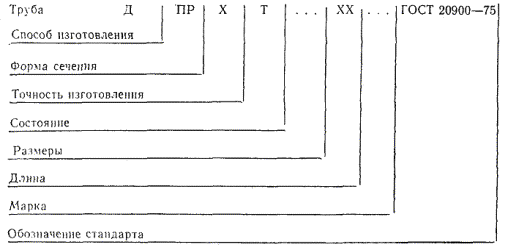 при следующих сокращениях: способ изготовления: тянутая Д форма сечения: прямоугольная ПР точность изготовления: нормальная Н повышенная П состояние: твердое Т длина: мерная МД немерная НД кратная КД Труба тянутая, прямоугольная, нормальной точности изготовления, твердая, размером сечения 248´124 мм, с толщиной стенки 3 мм, длиной 3000 мм, из меди марки М3: Труба ДПРНТ 248´124´3´3000 М3 ГОСТ 20900-75 То же, повышенной точности изготовления, твердая, размером 16´8 мм, с толщиной стенки 1 мм, немерной длины из латуни марки Л63: Труба ДПРПТ 16´8´1 НД Л63 ГОСТ 20900-75 То же, нормальной точности изготовления, твердая, размером сечения 40´5 мм, с толщиной стенки 1,5 мм, длиной, кратной 1500 мм, из латуни марки Л96: Труба ДПРНТ 40´5´1,5´1500 КД Л96 ГОСТ 20900-75 (Измененная редакция, Изм. № 2). 2. ТЕХНИЧЕСКИЕ ТРЕБОВАНИЯ2.1. Трубы должны изготовляться из меди марок М2, М3 по ГОСТ 859-78 и латуни марок Л96 и Л63 по ГОСТ 15527-70. Трубы изготовляют в соответствии с требованиями настоящего стандарта по технологическому регламенту, утвержденному в установленном порядке. 2.2. Трубы изготовляют в твердом состоянии. Трубы из латуни марки Л63 подвергают низкотемпературному отжигу. 2.3. Наружная поверхность труб не должна иметь трещин и расслоений. Не допускаются плены, вмятины, раковины, риски, задиры и забоины, если при контрольной зачистке они выводят трубы за предельные отклонения по толщине стенки. На поверхности труб допускаются цвета побежалости и покраснения. 2.4. Внутренняя поверхность труб должна быть гладкой и чистой, не должна иметь плен, раковин, трещин, забоин, расслоений, вмятин, рисок и задиров. Шероховатость поверхности труб повышенной точности изготовления Ra должна быть не более 0,63 мкм по ГОСТ 2789-73. По требованию потребителя шероховатость внутренней поверхности труб нормальной точности изготовления Ra должна быть не более 2,5 мкм по ГОСТ 2789-73. Продольные следы от волочения, мелкая поверхностная рябь, вызванная волочением, цвета побежалости, покраснения не являются браковочными признаками. По согласованию изготовителя с потребителем качество поверхности устанавливают по образцам, утвержденным в установленном порядке. (Измененная редакция, Изм. № 3). 2.1-2.4. (Измененная редакция, Изм. № 2). 2.5. Трубы должны быть ровно обрезаны и не должны иметь заусенцев. Косина реза не должна превышать: 3 мм - для труб внутренним сечением 90´45 мм и менее; 6 мм - для труб внутренним сечением свыше 90´45 мм до 180´90 мм включительно; 8 мм - для труб внутренним сечением свыше 180´90 мм. 2.6. Кривизна и скручивание на 1 м длины труб не должны превышать: 1 мм - для труб внутренним сечением от 2,4´1,2 до 5,2´2,6 мм включительно; 2 мм - для труб внутренним сечением от 7,2´3,4 до 35´15 мм включительно; 2,5 мм - для труб внутренний сечением от 40´5 до 48´24 мм включительно; 3 мм - для труб внутренним сечением от 58´10 до 90´45 мм включительно; 4 мм - для труб внутренним сечением свыше 90´45 мм. Примечание. По требованию потребителя трубы сечением свыше 90´45 мм допускается изготовлять с кривизной и скручиванием не более 3 мм на 1 м длины. При этом допускается в партии до 25 % труб с кривизной и скручиванием свыше 3 мм, но не более 4 мм. (Измененная редакция, Изм. № 2). 3. ПРАВИЛА ПРИЕМКИ3.1. Трубы принимают партиями. Партия должна состоять из труб одного размера, одной точности изготовления, одной марки металла или сплава и оформлена одним документом о качестве, содержащим: товарный зн