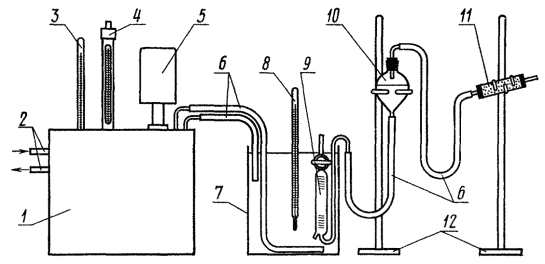Дата введения 01.07.77 Настоящий стандарт распространяется на автомобильные бензины и устанавливает метод оценки склонности бензинов к образованию паровых пробок в системе топливоподачи карбюраторных двигателей. Сущность метода заключается в испытании бензинов на лабораторной установке с последующей оценкой склонности к образованию паровых пробок по величине фазового соотношения пар - жидкость при заданных температурах нагрева. Метод предназначен для квалификационных испытаний и научно-исследовательских целей. 1. АППАРАТУРА, РЕАКТИВЫ И МАТЕРИАЛЫ1.1. При проведении испытаний применяют: ультратермостат, обеспечивающий нагрев с погрешностью не более 0,1 °С; бюретку паровую градуированную, вместимостью 35 см3 с ценой деления шкалы 0,5 см3 (черт. 1); склянку уравнительную вместимостью 250 - 300 см3; сосуд стеклянный цилиндрический диаметром 160 мм и высотой 250 мм; воронку стеклянную по ГОСТ 25336, типа 1а; колбу коническую по ГОСТ 25336, вместимостью 10 см3; шприц медицинский вместимостью 1 - 2 см3 с набором игл; бюретку 6-2-5 по ГОСТ 29251; сосуд Дьюара цилиндрический внутренним диаметром не менее 40 мм и глубиной 200 мм; баню охлаждающую водо-ледяную или холодильник; трубку с хлористым кальцием; грушу резиновую № 3; термометр ртутный электроконтактный по ГОСТ 9871, типа ТПК-4-П-200; термометр ртутный контрольный по ГОСТ 28498; термометр ртутный стеклянный по ГОСТ 28498, ТЛ-5, типа 2; барометр-анероид метеорологический; линейку измерительную с пределами шкалы 0 - 500 мм; штативы лабораторные; трубку резиновую наружным диаметром 14 мм и внутренним диаметром 10 мм; трубку резиновую наружным диаметром 12 мм и внутренним диаметром 8 мм; трубки стеклянные наружным диаметром 4 - 4,5 и 8 мм; глицерин обезвоженный по ГОСТ 6259; кальций хлористый; ацетон по ГОСТ 2603; воду дистиллированную по ГОСТ 6709; Паровая бюретка 1 - верхний отвод; 2 - запорный краник с отверстием 2 мм; 3 - донный отвод; 4 - нижний боковой отвод Черт. 1 коллодий медицинский и полиграфический; цапонлак; жидкость смазочная М-1. (Измененная редакция, Изм. № 1). 2. ПОДГОТОВКА К ИСПЫТАНИЮ2.1. Для проведения испытаний пробы автомобильных бензинов отбирают по ГОСТ 2517. После отбора проб бутылки плотно закрывают корковыми пробками, которые заливают коллодием или цапонлаком и хранят в лабораторных условиях при температуре не выше 20 °С не более 45 сут. 2.2. Калибровку паровой бюретки и шприца проводят при помощи микробюретки. 2.3. Собирают лабораторную установку по схеме, указанной на черт. 2. 2.3.1. Устанавливают в ультратермостат электроконтактный и контрольный термометры и подсоединяют его резиновыми трубками к водопроводной сети и стоку в канализацию. 2.3.2. Нагнетающий и отсасывающий штуцеры ультратермостата соединяют резиновыми трубками с водяной баней. При этом резиновую трубку нагнетающего штуцера укладывают полукольцом на дне сосуда, а резиновую трубку отсасывающего штуцера опускают в водяную баню на 0,25 - 0,3 ее высоты. 2.3.3. Соединяют резиновыми трубками уравнительную склянку, паровую бюретку и влагопоглощающую трубку. 1 - ультратермостат; 2 - вход и выход воды; 3 - термометр контрольный по ГОСТ 28498; 4 - термометр электроконтактный; 5 - насос циркуляционный; 6 - трубки резиновые; 7 - баня стеклянная водяная; 8 - термометр по ГОСТ 28498; 9 - бюретка паровая; 10 - склянка уравнительная; 11 - трубка хлоркальциевая; 12 - штативы лабораторные Черт. 2 2.4. Наполняют бач