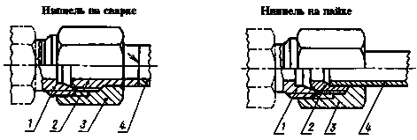 1 -конец корпусной детали; 2- ниппель по ГОСТ 23355; 3-накидная гайка по ГОСТ 23353; 4-труба