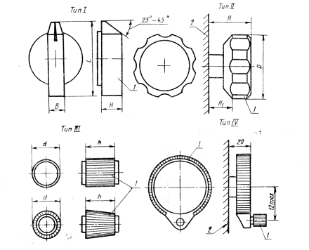 Постановлением Государственного комитета стандартов Совета Министров СССР от 4 июля 1977 г. № 1677 срок введения установлен с 01.07.78 1. Настоящий стандарт распространяется на все виды поворотных выключателей и переключателей и устанавливает общие эргономические требования к их приводным элементам. Термины и определения, применяемые в стандарте, даны в справочном приложении 1. 2. Поворотные выключатели и переключатели применяют для операций включения-выключения, последовательного переключения и для плавного непрерывного или ступенчатого (дискретного) регулирования. 3. По характеру взаимодействия руки человека-оператора с приводными элементами поворотных выключателей и переключателей приводные элементы подразделяют на четыре основных типа (см. справочное приложение 2): I тип - приводной элемент, захват которого производится большим и фалангой указательного пальцев руки человека-оператора; II тип - приводной элемент, захват которого производится пятью пальцами (кистью) руки человека-оператора; III и IV типы - приводной элемент, захват которого производится большим, указательным и средним пальцами руки человека-оператора. 4. Поворот выключателя или переключателя по часовой стрелке должен приводить к включению, увеличению параметра, а против часовой стрелки - к его выключению, уменьшению параметра. При этом должен соблюдаться принцип соответствия движения указателя индикаторного устройства движению органа управления. 5. Приводные элементы повторных переключателей должны иметь надежное крепление их на оси, исключающее их поворачивание и соскакивание. 6. При высоте приводных элементов I, II и III типов меньше 12 мм необходимо в нижней их части устанавливать шайбу (диск) для предотвращения трения пальцев человека-оператора о панель прибора, пульта. 7. Рабочая поверхность приводных элементов II, III и IV типов должна иметь удобные для захвата пальцами человека-оператора выемки, насечку или рифление, обеспечивающие соблюдение гигиенических требований. 8. На рабочей поверхности приводных элементов I типа не должно быть выступов крепления на оси выключателей и переключателей. Приводные элементы в местах захвата пальцами оператора не должны иметь острых ребер. 9. Начальные положения однотипных приводных элементов поворотных выключателей и переключателей должны быть одинаково ориентированными на панели, максимальное число положений - 24. 10. Приводные элементы для повторных переключателей ступенчатого переключения и включения-выключения (типа I и II) должны иметь указатель (стрелку, точку, метку и др.), а также надежную фиксацию положения, дающие возможность быстро и однозначно определить позицию переключения. На панелях, где устанавливаются переключатели с приводными элементами I и II типов, необходимо выполнять метки деления шкалы, соответствующие фиксированным положениям переключателя; указатель на приводном элементе должен располагаться возможно ближе к неподвижной шкале. 11. При обозначении приводных элементов необходимо соблюдать единообразие размещения и графического решения надписей и символов, при этом надписи и символы следует размещать в непосредственной близости от приводных элементов. При наличии нескольких надписей, относящихся к одному приводному элементу, допускается располагать их вокруг приводного элемента. Во все