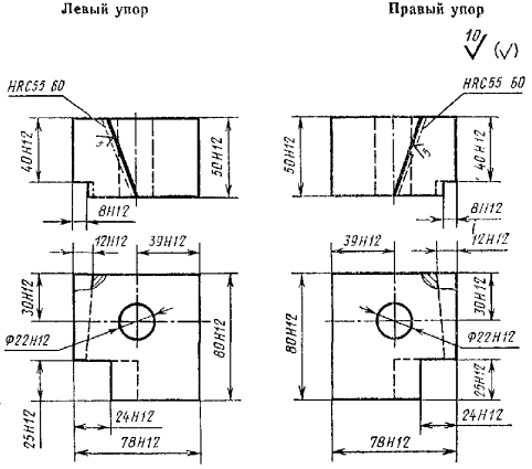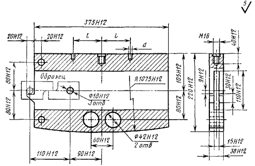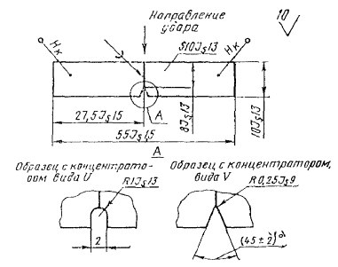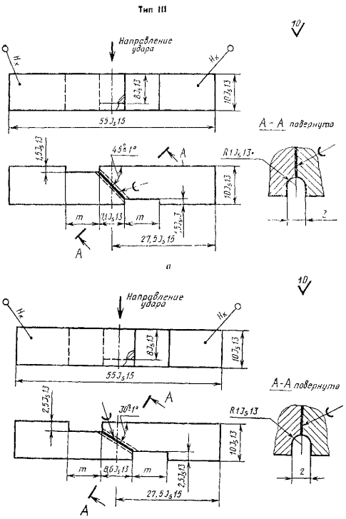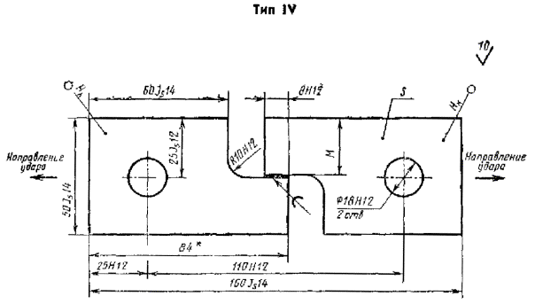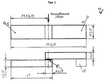 Черт. 4 2. ПОДГОТОВКА К ИСПЫТАНИЯМ2.1. Образцы для испытаний следует изготовлять из спаянных для этой цели заготовок или из контролируемого соединения. 2.2. Рекомендуется брать длину заготовки обеспечивающую, вырезку не менее пяти образцов типа I-III. 2.3. Вырезку заготовок для образцов необходимо производить механическим способом. Допускается применять другие способы резки, при этом должен быть предусмотрен припуск, обеспечивающий удаление зоны термического влияния или наклепа. 2.4. При пайке заготовок марка паяемого материала, подготовка поверхности, припой, среда или флюс, зазор между паяемыми заготовками, способ и режим пайки должны быть такими, как в разрабатываемом технологическом процессе. 2.5. Величину зазора при пайке рекомендуется обеспечивать с помощью соответствующих приспособлений. Допускается обеспечивать зазор с помощью прокладок. Прокладки рекомендуется изготовлять из паяемого материала. Участок паяного шва с прокладками должен быть удален в процессе изготовления образцов. 2.6. Правка и рихтовка паяных заготовок не допускаются. 2.7. Надрез на паяных образцах должен быть выполнен в соответствии с требованиями ГОСТ 9454-78 (СТ СЭВ 472-77, СТ СЭВ 473-77). (Измененная редакция, Изм. № 1). 2.8. Образцы из паяных заготовок или контролируемого соединения должны изготовляться на металлорежущих станках или с помощью анодно-механической резки. Заусенцы на гранях образцов должны быть удалены лёгкой запиловкой с радиусом скругления не более 1 мм. 2.9. При изготовлении образцов типов I и IV следует обеспечивать радиус галтели не более 0,3 мм. Допускается механическая обработка галтели. (Новая редакция, Изм. № 1). 2.10. Перед испытаниями следует измерить с точностью до 0,1 мм длину и ширину шва образцов, паяных внахлестку и встык, а также длину шва образцов, паяных вскос. Ширину шва образцов, паяных вскос, следует вычислять по результатам измерения линейных размеров образцов, округляя значения до 0,1 мм. По полученным результатам вычисляют площадь паяного шва, округляя значения до 0,5 мм2. При вычислении площади паяного шва сечение галтели не учитывают. (Измененная редакция, Изм. № 1). 2.11. Каждый образец необходимо маркировать в местах, указанных на черт. 1-4. 3. ТРЕБОВАНИЯ К ОБОРУДОВАНИЮ И АППАРАТУРЕ ДЛЯ ИСПЫТАНИЙ3.1. Испытания паяных образцов следует проводить на маятниковых копрах по ГОСТ 10708-82. 3.2. Для испытания паяных образцов типа IV на ударный срез нож маятника заменяют ударным грузом, в котором крепят образец, а на станине копра устанавливают специальные упоры. 3.3. Форма и размеры упоров должны соответствовать указанным на черт. 5. 3.4. Запас энергии маятника с ударным грузом должен соответствовать шкале копра при любом значении угла подъема маятника. 3.5. Место крепления паяного образца в ударном грузе должно быть определено с таким расчетом, чтобы ударный импульс был направлен по касательной к окружности, которую описывает центр удара маятника. 3.6. Расстояние от оси подвески маятника до центра удара (L) в миллиметрах вычисляют по формуле