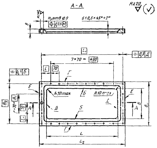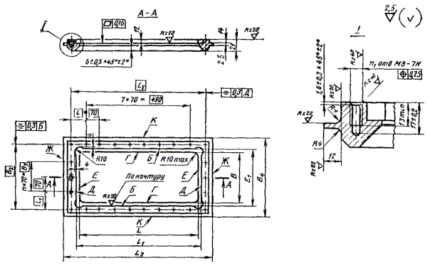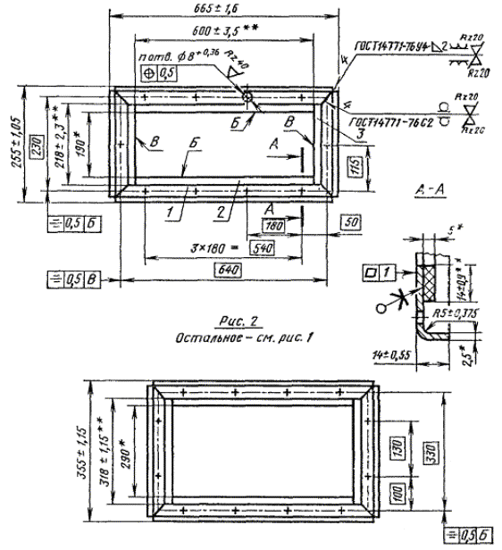 2.1.5. Материал - резина тепло-морозо-кислото-щелочестойкая мягкая (ТМКЩМ) толщиной 5 мм по ГОСТ 7338-77 или пластины резиновые для уплотнительных прокладок вакуумных систем. Пример условного обозначения окон типа К исполнений 1, 2 и 3 с размерами L´В = 580´150 мм Окно К1-580-150 ГОСТ 23410-78 Окно К2-580-150 ГОСТ 23410-78 Окно К3-580-150 ГОСТ 23410-78 (Измененная редакция, Изм. № 1). 2.1.6. Неперпендикулярность поверхности Б корпуса относительно поверхности Д не должна быть более 0,25 мм. 2.1.7. Несимметричность поверхностей Г и К корпуса относительно поверхностей Б и поверхностей Е и Ж относительно поверхности Д не должна быть более 0,5 мм, 2.1.8. Несимметричность поверхности Г рамки относительно поверхности Б и поверхности Д относительно поверхности Е не должна быть более 0,5 мм. 2.1.9. Неуказанные предельные отклонения размеров: отверстия Н14, валов h14, остальных 2.1.10. Покрытие деталей окна из углеродистой стали цинковое с хроматированием по ГОСТ 9.306-85. (Измененная редакция, Изм. № 2). 2.1.11. Конструкция окон типа К должна обеспечивать герметичность боксов при избыточном давлении в них 2∙103 Па (200 мм вод. ст.) во время испытаний и вакуумметрическом давлении 2∙102 Па (20 мм вод. ст.) при эксплуатации. 2.2. Окна типа У должны изготовляться в трех исполнениях: 1 - с прижимными рамками, уголками и шпильками из углеродистой стали; 2 - с прижимными рамками из углеродистой стали, уголками и шпильками из коррозионно-стойкой стали; 3 - с прижимными рамками, уголками и шпильками из коррозионностойкой стали. 2.2.1. Конструкция, размеры и обозначения окон типа У и их составных частей должны соответствовать указанным на черт. 6-12 и в табл. 7-9. ___________ * Размеры для справок. ** Размеры между уголками. 1 - прижимная рамка; 2 - маховичок; 3 - уголок; 4 - прокладка; 5 - шпилька; 6 - стекло; 7 - шайба. Черт. 6 Рамка прижимная Рис. 1