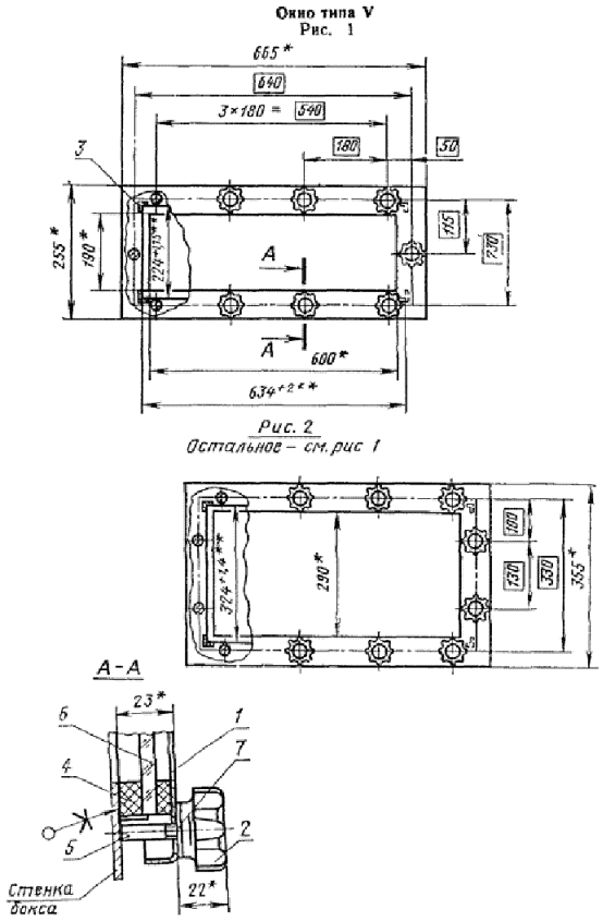Постановлением Государственного комитета СССР по стандартам от 28 декабря 1978 г. № 32 срок введения установлен с 01.01.80 Проверен в 1984 г. Несоблюдение стандарта преследуется по закону Настоящий стандарт распространяется на смотровые окна, применяемые в защитных боксах с перчатками и манипуляторами, предназначенные для работы с радиоактивными веществами и другими источниками ионизирующих излучений. Стандарт устанавливает типы, конструкцию и размеры окон. 1. ТИПЫ1.1. В зависимости от способа крепления стекла устанавливаются следующие типы окон защитных боксов: К - с креплением стекла в стальном корпусе с помощью рамки и болтов; У - с креплением стекла в стальных уголках с помощью коробчатой рамки, шпилек, привариваемых к корпусу бокса, и маховичков (гаек); П - с креплением стекла в резиновом профиле. 2. КОНСТРУКЦИЯ И РАЗМЕРЫ2.1. Окна типа К должны изготовляться в трех исполнениях: 1 - с корпусом и рамкой из углеродистой стали; 2 - с корпусом из коррозионно-стойкой стали, рамкой из углеродистой стали; 3 - с корпусом и рамкой из коррозионно-стойкой стали. 2.1.1. Конструкция, размеры и обозначения окон типа К и их составных частей должны соответствовать указанным на черт. 1-5 и в табл. 1-6. Окно типа К _____________ Размеры для справок 1 - корпус; 2 - рамка; 3 - стекло; 4 - прокладка; 5 - болт. Черт. 1 Размеры, мм Таблица 1