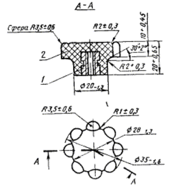 1 - втулка; 2 - фенопласт марок 03-010-02, Э1-340-02, В´2-090-09 по ГОСТ 5689-79. Черт. 8 Втулка маховичка