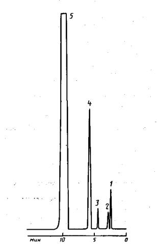 1- гелий; 2- водород; 3- кислород; 4- азот; 5- метан Типичная хроматограмма разделения газа на колонке с эфиром ТЭГМ, нанесенным на сферохром, приведена на черт. 2. Порядок выхода компонентов и относительное время удерживания (газ-носитель-гелий) приведены в табл. 2. Таблица 2
