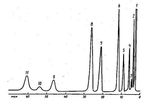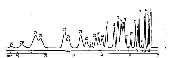 2.3.6. Хроматограмма разделения природного газа на колонке с SE-30, нанесенным на хроматон, при условиях, указанных в п. 2.3.5, приведена на черт. 3. На этой колонке метан, этан и пропан выделяются без разделения; изомеры бутана, пептана, гексана и основные изомеры гептана выделяются раздельно, изомеры углеводородов С8 и выше суммарными группами. Порядок выхода компонентов и время удерживания относительно н-бутана приведены в табл. 4 (газ-носитель-гелий). Таблица 4